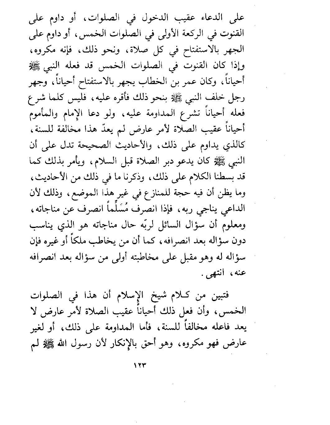 فتبين من كلام شيخ الإسلام أن هذا في الصلوات الخمس، وأن فعل ذلك أحياناً عقيب الصلاة لأمر عارض لا يعد فاعله مخالفاً للسنة، فأما المداومة على ذلك، أو لغير عارض فهو مكروه، وهو أحق بالإنكار لأن رسول الله صلى الله عليه وسلم لم