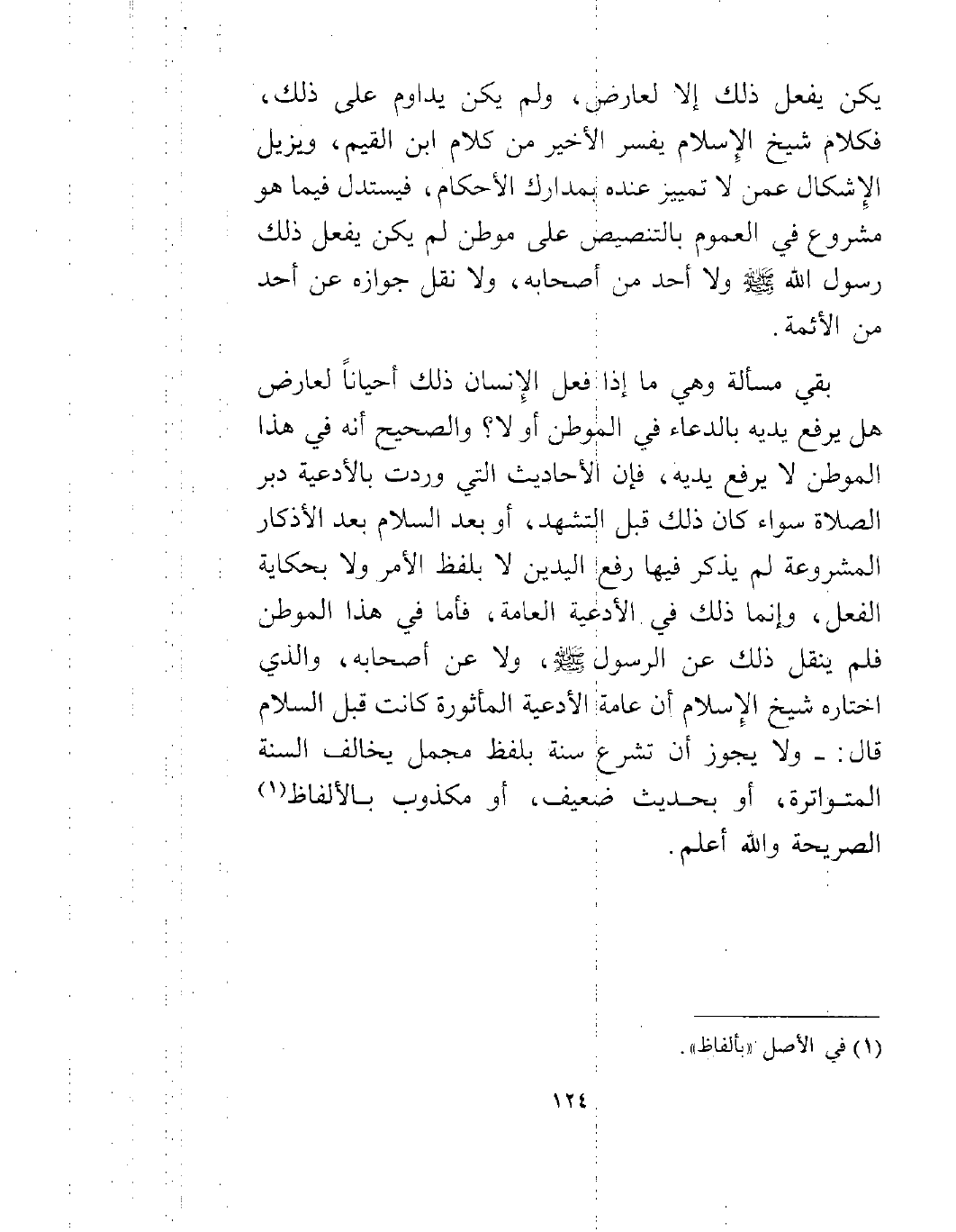 بقي مسألة وهي: ما إذا فعل الإنسان ذلك أحياناً لعارض هل يرفع يديه بالدعاء في الموطن أو لا؟ والصحيح أنه في هذا الموطن لا يرفع يديه، فإن الأحاديث التي وردت بالأدعية دبر الصلاة سواء كان ذلك قبل التشهد، أو بعد السلام بعد الأذكار المشروعة لم يذكر فيها رفع اليدين لا بلفظ الأمر ولا بحكاية الفعل، وإنما ذلك في الأدعية العامة، فأما في هذا الموطن فلم ينقل ذلك عن الرسول صلى الله عليه وسلم، ولا عن أصحابه، والذي اختاره شيخ الإسلام أن عامة الأدعية المأثورة كانت قبل السلام: ولا يجوز أن تشرع سنة بلفظ مجمل يخالف السنة المتواترة، أو بحديث ضعيف، أو مكذوب بالألفاظ1 الصريحة والله أعلم.