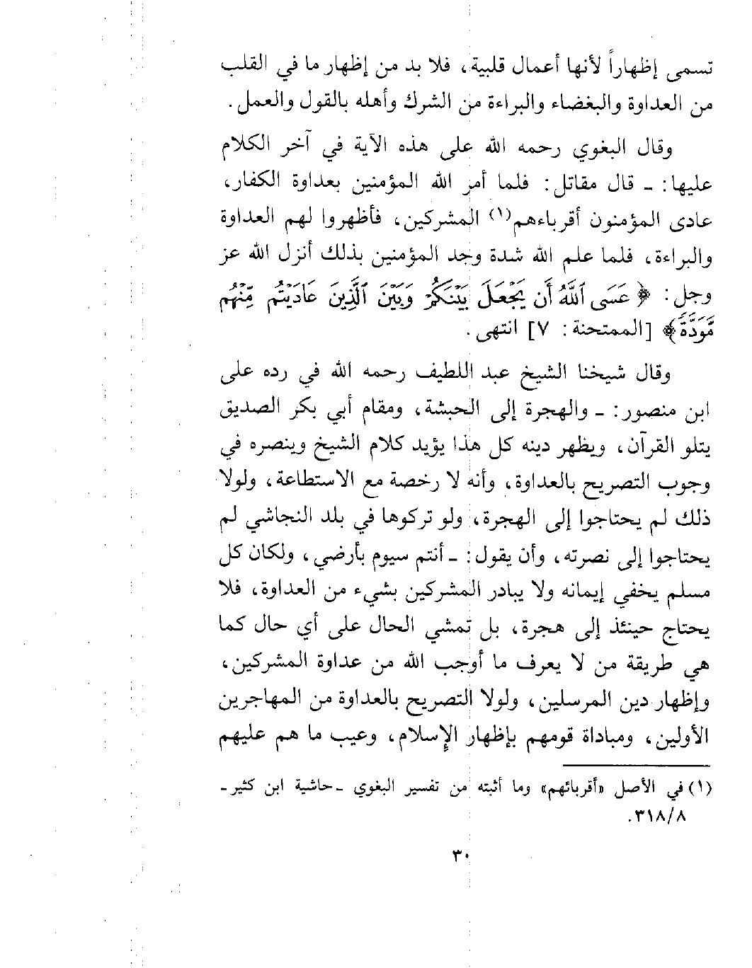 وقال شيخنا الشيخ عبد اللطيف رحمه الله في رده على ابن منصور: والهجرة إلى الحبشة، ومقام أبي بكر الصديق يتلوا القرآن، ويظهر دينه كل هذا يؤيد كلام الشيخ وينصره في وجوب التصريح بالعداوة، وأنه لا رخصة مع الاستطاعة، ولولا ذلك لم يحتاجوا إلى الهجرة، ولو تركوها في بلد النجاشي لم يحتاجوا إلى نصرته، وأن يقول: أنتم سيوم بأرضي، ولكان كل مسلم يخفي إيمانه ولا يبادر المشركين بشيء من العداوة، فلا يحتاج حينئذ إلى هجرة، بل تمشي الحال على أي حال كما هي طريقة من لا يعرف ما أوجب الله من عداوة المشركين، وإظهار دين المرسلين، ولولا التصريح بالعداوة من المهاجرين الأولين، ومباداة قومهم بإظهار الإسلام، وعيب ما هم عليهم
