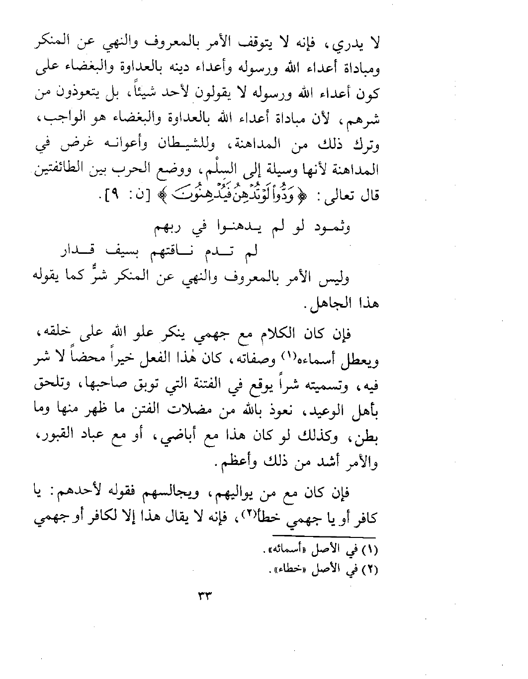 لا يدري، فإنه لا يتوقف الأمر بالمعروف والنهي عن المنكر ومباداة أعداء الله ورسوله وأعداء دينه بالعداوة والبغضاء على كون أعداء الله ورسوله لا يقولون لأحد شيئاً، بل يتعوذون من شرهم لأن مباداة أعداء الله بالعداوة والبغضاء هو الواجب، وترك ذلك من المداهنة، وللشيطان وأعوانه غرض في الطائفتين قال تعالى: {وَدُّوا لَوْ تُدْهِنُ فَيُدْهِنُونَ} [القلم:9] .