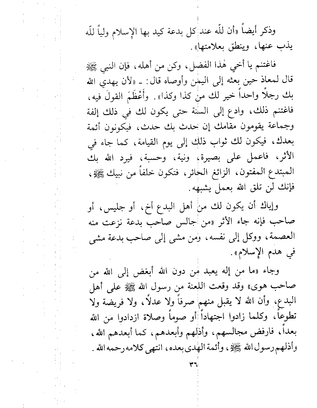 وجاء "ما من إله يعبد من دون الله أبغض إلى الله من صاحب هوى" وقد وقعت اللعنة من رسول الله صلى الله عليه وسلم على أهل البدع، وأن الله لا يقبل منهم صرفاً ولا عدلاً، ولا فريضة ولا تطوعاً، وكلما زادوا اجتهاداً أو صوماً وصلاة ازدادوا من الله بعداً، فارفض مجالسهم، وأذلهم وأبعدهم، كما أبعدهم الله، وأذلهم رسول الله صلى الله عليه وسلم، وأئمة الهدى بعده، انتهى كلامه رحمه الله.