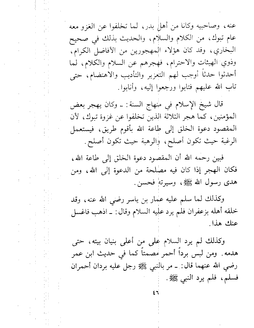 قال شيخ الإسلام في منهاج السنة: وكان يهجر بعض المؤمنين، كما هجر الثلاثة الذين تخلفوا عن غزوة تبوك، لأن المقصود دعوة الخلق إلى طاعة الله بأقوم طريق، فيستعمل الرغبة حيث تكون أصلح، والرهبة حيث تكون أصلح.