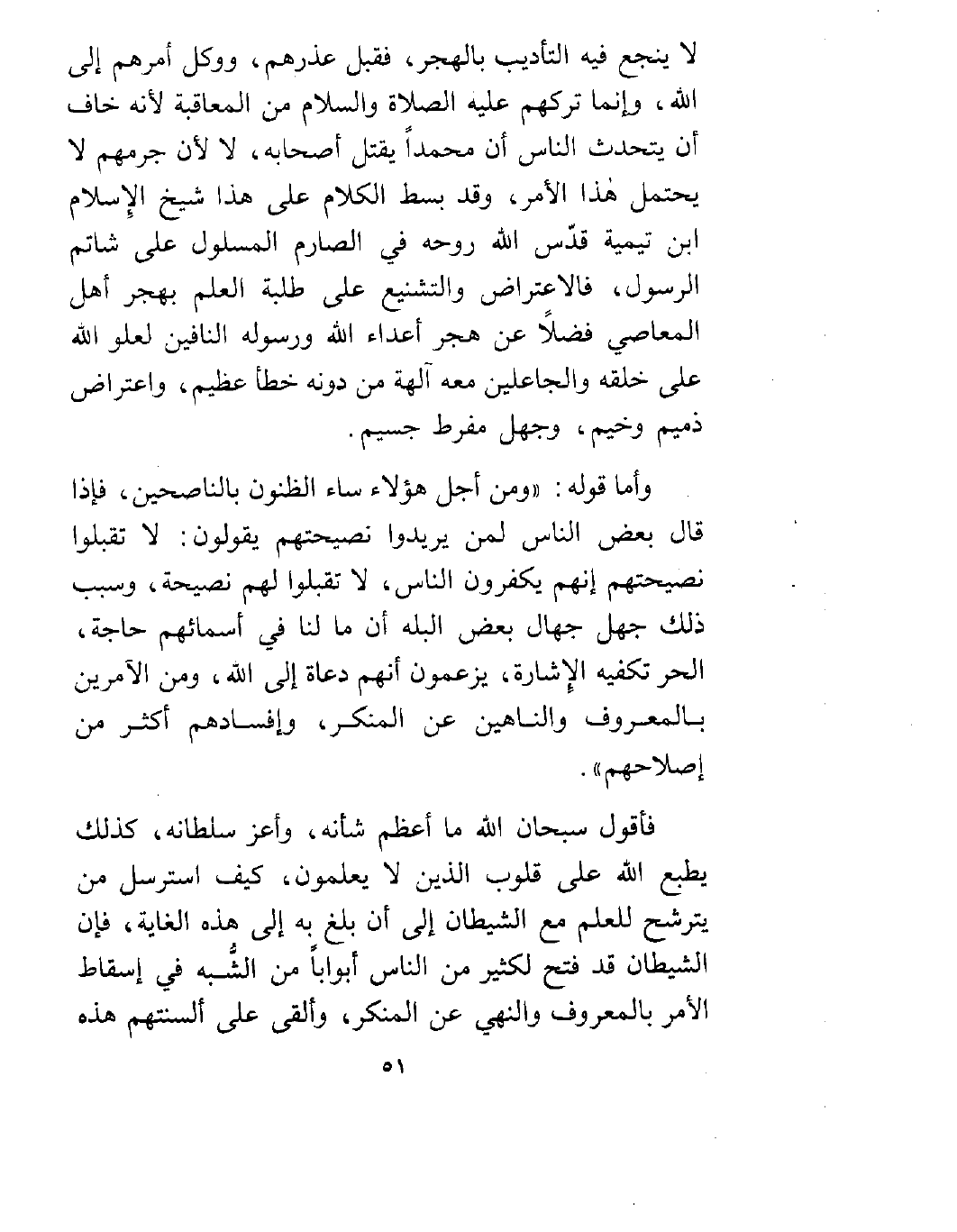 فأقول سبحان الله ما أعظم شأنه، وأعز سلطانه، كذلك يطبع الله على قلوب الذين لا يعلمون، كيف استرسل من يترشح للعلم مع الشيطان إلى أن بلغ به إلى هذه الغاية، فإن الشيطان قد فتح لكثير من الناس أبواباً من الشُّبَه في إسقاط الأمر بالمعروف والنهي عن المنكر، وألقى على ألسنتهم هذه
