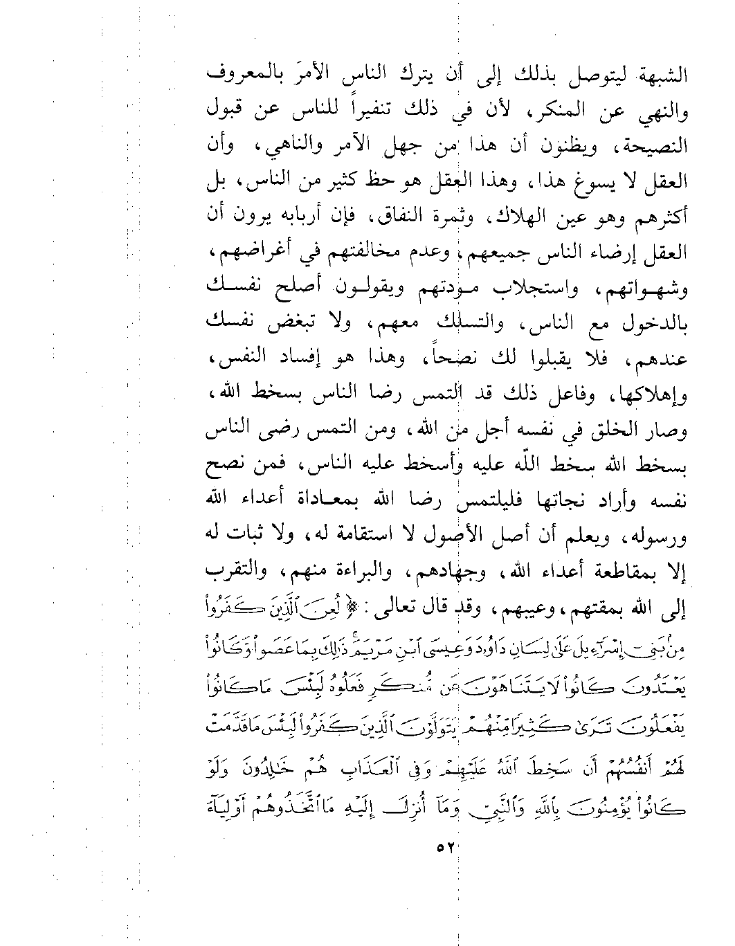 الشبهة ليتوصل بذلك إلى أن يترك الناس الأمرَ بالمعروف والنهي عن المنكر، لأن في ذلك تنفيراً للناس عن قبول النصيحة، ويظنون أن هذا من جهل الآمر والناهي، وأن العقل لا يسوغ هذا، وهذا العقل هو حظ كثير من الناس، بل أكثرهم وهو عين الهلاك، وثمرة النفاق، فإن أربابه يرون أن العقل إرضاء الناس جميعهم، وعدم مخالفتهم في أغراضهم، وشهواتهم، واستجلاب مودتهم ويقولون أصلح نفسك بالدخول مع الناس، والتسلك معهم، ولا تبغض نفسك عندهم، فلا يقبلوا لك نصحاً، وهذا هو إفساد النفس وإهلاكها، وفاعل ذلك قد التمس رضا الناس بسخط الله وصار الخلق في نفسه أجل من الله، ومن التمس رضى الناس في سخط الله سخط الله عليه وأسخط عليه الناس، فمن نصح نفسه وأراد نجاتها فليلتمس رضا الله بمعاداة أعداء الله ورسوله، ويعلم أن أصل الأصول لا استقامة له، ولا ثبات إلا بمقاطعة أعداء الله، وجهادهم، والبراءة منهم والتقرب إلى الله بمقتهم، وعيبهم، وقد قال تعالى: {لُعِنَ الَّذِينَ كَفَرُوا مِنْ بَنِي إِسْرائيلَ عَلَى لِسَانِ دَاوُدَ وَعِيسَى ابْنِ مَرْيَمَ ذَلِكَ بِمَا عَصَوْا وَكَانُوا يَعْتَدُونَ * كَانُوا لا يَتَنَاهَوْنَ عَنْ مُنْكَرٍ فَعَلُوهُ لَبِئْسَ مَا كَانُوا يَفْعَلُونَ * تَرَى كَثِيراً مِنْهُمْ يَتَوَلَّوْنَ الَّذِينَ كَفَرُوا لَبِئْسَ مَا قَدَّمَتْ لَهُمْ أَنْفُسُهُمْ أَنْ سَخِطَ اللَّهُ عَلَيْهِمْ وَفِي الْعَذَابِ هُمْ خَالِدُونَ * وَلَوْ كَانُوا يُؤْمِنُونَ بِاللَّهِ وَالنَّبِيِّ وَمَا أُنْزِلَ إِلَيْهِ مَا اتَّخَذُوهُمْ أَوْلِيَاءَ