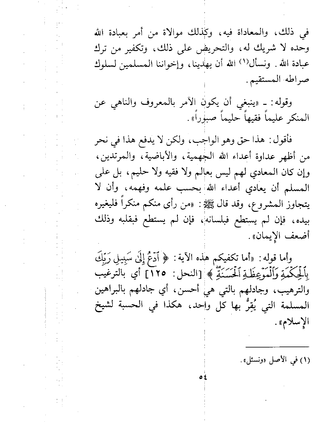 وأما قوله: "أما تكفيكم هذه الآية: {ادْعُ إِلَى سَبِيلِ رَبِّكَ بِالْحِكْمَةِ وَالْمَوْعِظَةِ الْحَسَنَةِ} [النحل: 125] آي بالترغيب والترهيب، وجادلهم بالتي هي أحسن، أي جادلهم بالبراهين المسلمة التي يُقِرُّ بها كل واحد، هكذا في الحسبة لشيخ الإسلام".