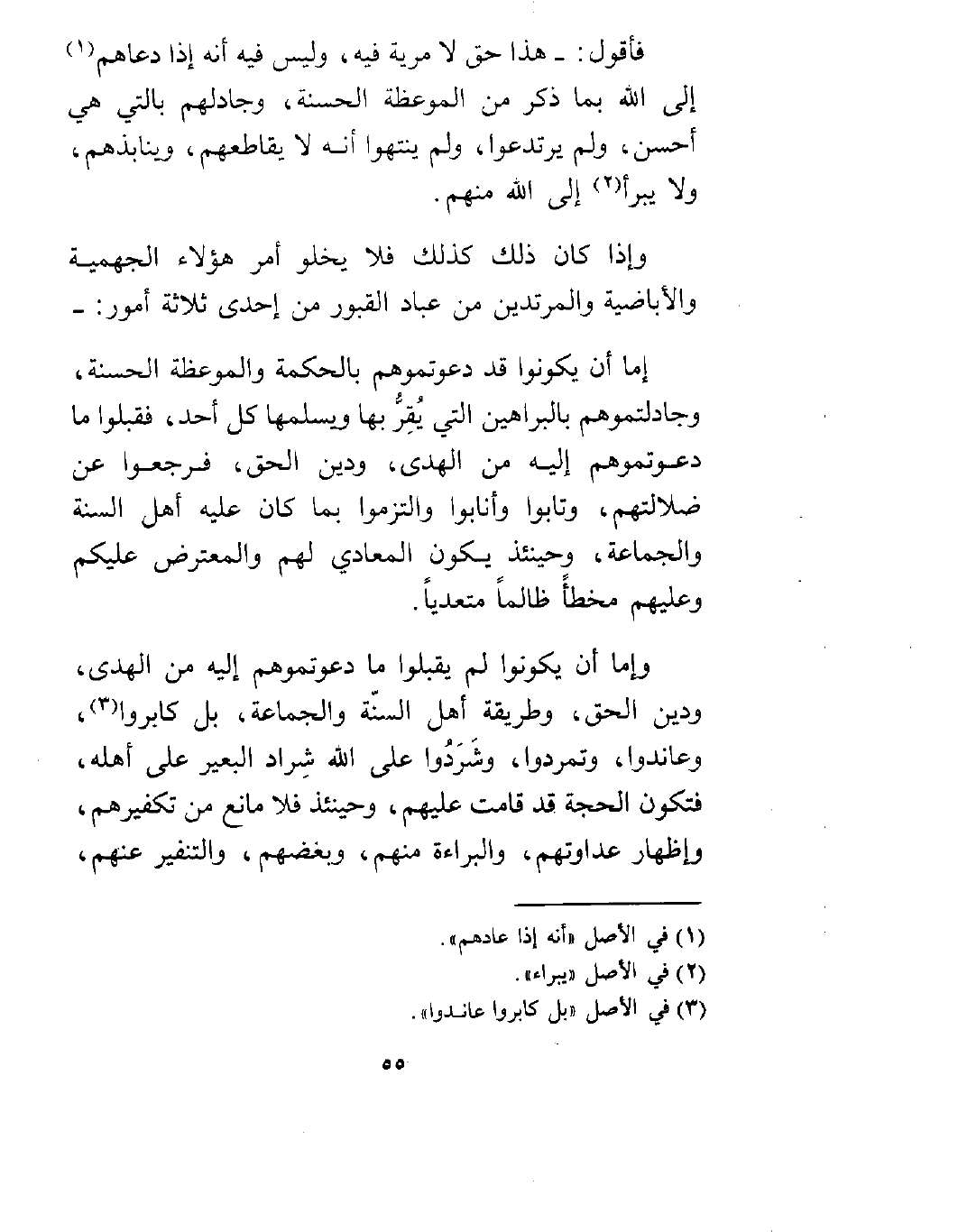 فأقول: هذا حق لا مرية فيه، وليس فيه أنه إذا دعاهم1 إلى الله بما ذكر من الموعظة الحسنة، وجادلهم بالتي هي أحسن، ولم يرتدعوا، ولم ينتهوا أنه لا يقاطعهم، وينابذهم، ولا يبرأ2 إلى الله منهم.
