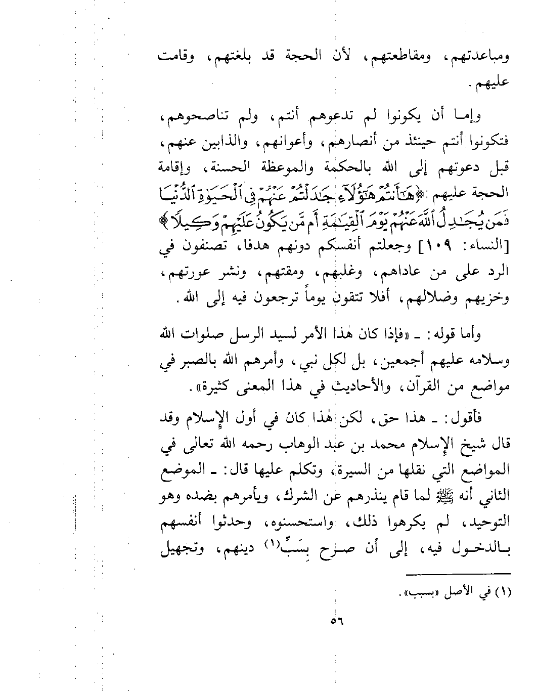 فأقول: هذا حق، لكن هذا كان في أول الإسلام وقد قال شيخ الإسلام محمد بن عبد الوهاب رحمه الله تعالى في المواضع التي نقلها من السيرة، وتكلم عليها قال: الموضع الثاني أنه صلى الله عليه وسلم لما قام ينذرهم عن الشرك، ويأمرهم بضده وهو التوحيد، لم يكرهوا ذلك، واستحسنوه، وحدثوا أنفسهم بالدخول فيه، إلى أن صرح بِسَبِّ1 دينهم، وتجهيل
