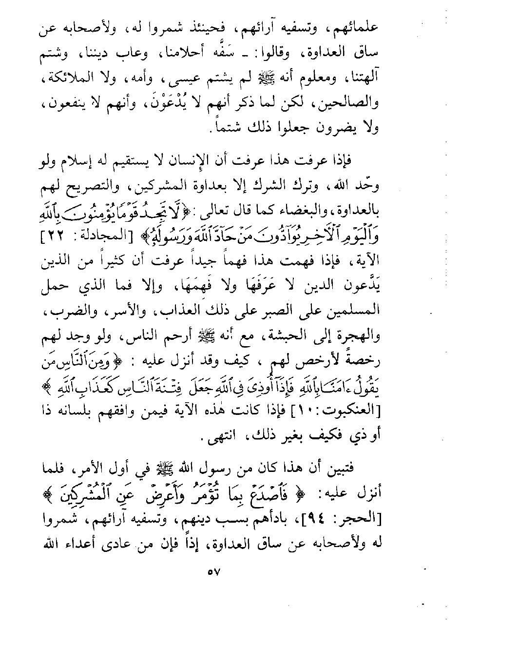 فإذا عرفت هذا عرفت أن الإنسان لا يستقيم له إسلام ولو وحّد الله، وترك الشرك إلا بعداوة المشركين، والتصريح لهم بالعداوة، والبغضاء كما قال تعالى: {لا تَجِدُ قَوْماً يُؤْمِنُونَ بِاللَّهِ وَالْيَوْمِ الْآخِرِ يُوَادُّونَ مَنْ حَادَّ اللَّهَ وَرَسُولَهُ} [المجادلة: 22] الآية فإذا فهمت هذا فهماً جيداً عرفت أن كثيراً من الذين يدعون الدين لا عَرَفَهَا ولا فَهِمَهَا، وإلا فما الذي حمل المسلمين على الصبر على ذلك العذاب، والأسر، والضرب، والهجرة إلى الحبشة، مع أنه صلى الله عليه وسلم أرحم الناس، ولو وجد لهم رخصةً لأرخص لهم، كيف وقد أُنْزِلَ عليه: {وَمِنَ النَّاسِ مَنْ يَقُولُ آمَنَّا بِاللَّهِ فَإِذَا أُوذِيَ فِي اللَّهِ جَعَلَ فِتْنَةَ النَّاسِ كَعَذَابِ اللَّهِ} [العنكبوت: 10] فإذا كانت هذه الآية فيمن وافقهم بلسانه ذا أو ذي فكيف بغير ذلك، انتهى.