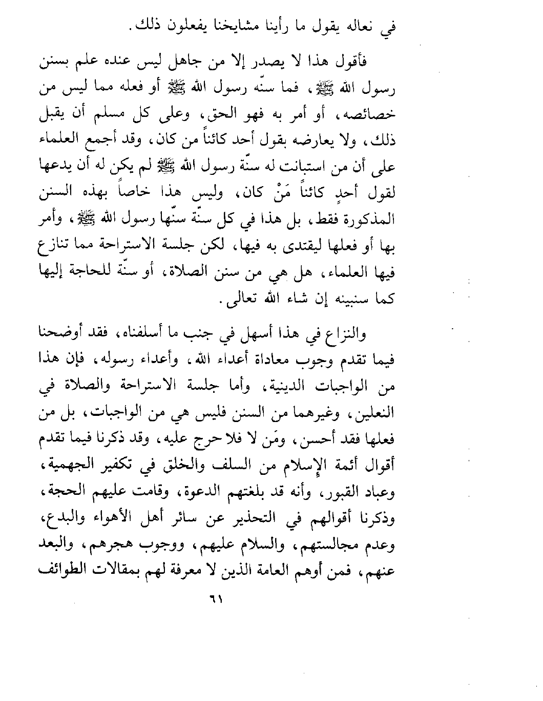 والنزاع في هذا أسهل في جنب ما أسلفناه، فقد أوضحنا فيما تقدم وجوب معاداة أعداء الله، وأعداء رسوله، فإن هذا من الواجبات الدينية، وأما جلسة الاستراحة والصلاة في النعلين، وغيرهما من السنن فليس هي من الواجبات، بل من فعلها فقد أحسن، ومَن لا فلا حرج عليه، وقد ذكرنا فيما تقدم أقوال أئمة الإسلام من السلف والخلق في تكفير الجهمية، وعباد القبور، وأنه قد بلغتهم الدعوة، وقامت عليهم الحجة، وذكرنا أقوالهم في التحذير عن سائر أهل الأهواء والبدع، وعدم مجالستهم، والسلام عليهم ووجوب هجرهم، والبعد عنهم، فمن أوهم العامة الذين لا معرفة لهم بمقالات الطوائف