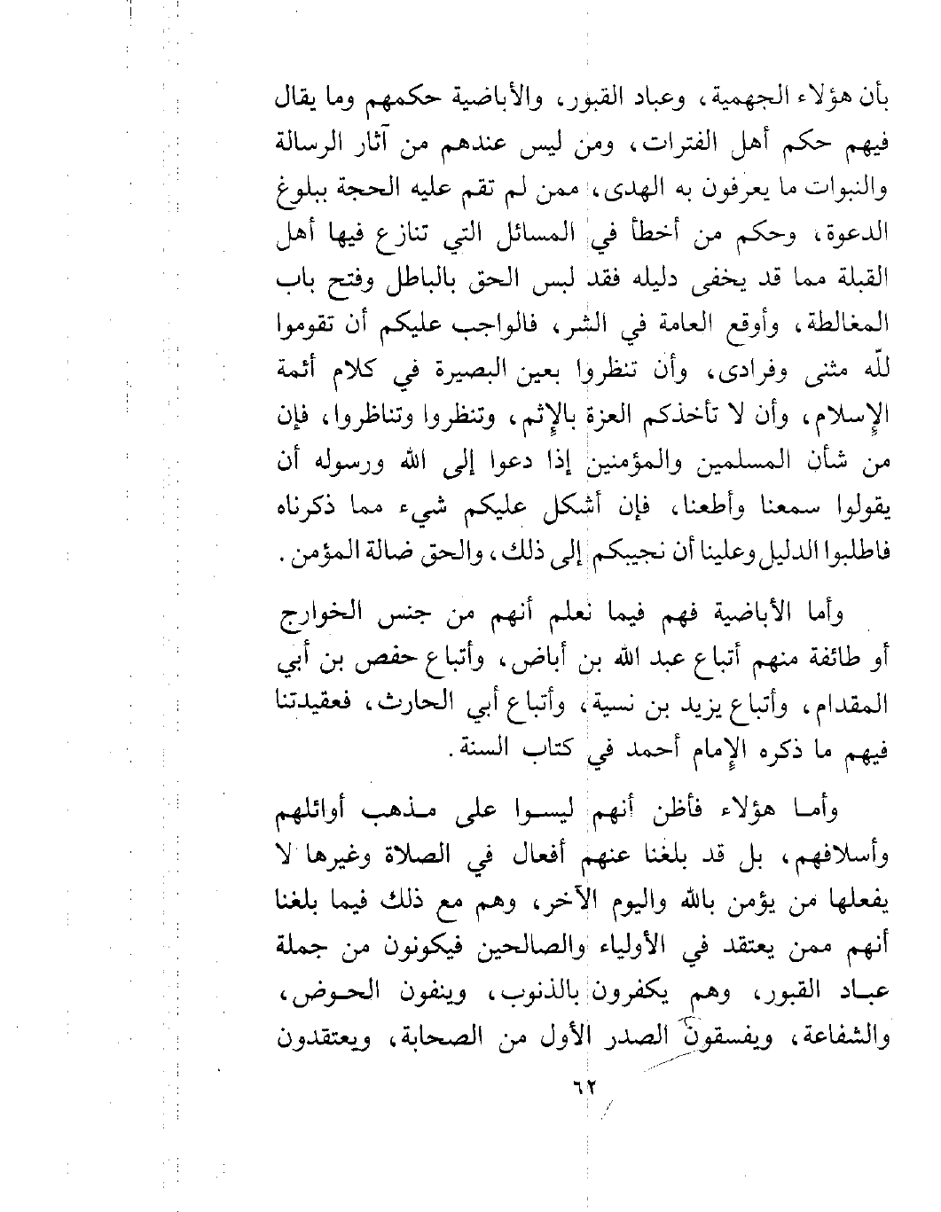 بأن هؤلاء الجهمية، وعباد القبور، والإباضية حكمهم وما يقال فيهم حكم أهل الفترات، ومن ليس عندهم من آثار الرسالة والنبوات ما يعرفون به الهدى، ممن لم تقم عليه الحجة ببلوغ الدعوة، وحكم من أخطأ في المسائل التي تنازع فيها أهل القبلة مما قد يخفى دليله فقد لبّس الحق بالباطل وفتح باب المغالطة، وأوقع العامة في الشر، فالواجب عليكم أن تقوموا لله مثنى وفرادى، وأن تنظروا بعين البصيرة في كلام أئمة الإسلام، وأن لا تأخذكم العزة بالإثم، وتنظروا وتناظروا، فإن من شأن المسلمين والمؤمنين إذا دعوا إلى الله ورسوله أن يقولوا سمعنا وأطعنا، فإن أشكل عليكم شيء مما ذكرناه فاطلبوا الدليل وعلينا أن نجيبكم إلى ذلك، والحق ضالة المؤمن.