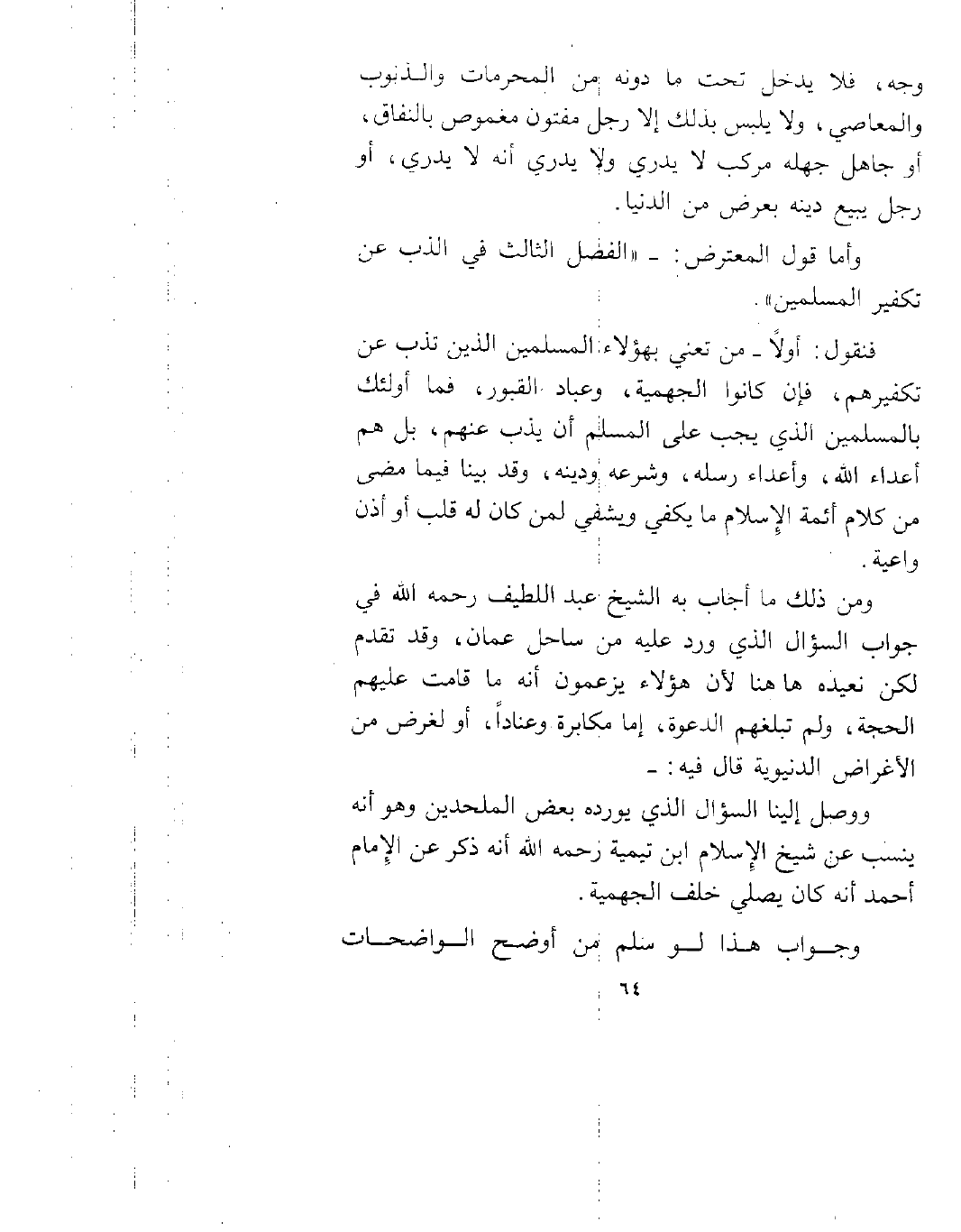 فنقول: أولا: من تعني بهؤلاء المسلمين الذين تذب عن تكفيرهم، فإن كانوا الجهمية، وعباد القبور، فما أولئك بالمسلمين الذي يجب على المسلم أن يذب عنهم، بل هم أعداء الله وأعداء رسله، وشرعه ودينه، وقد بينا فيما مضى من كلام أئمة الإسلام ما يكفي ويشفي لمن كان له قلب أو أذن أو واعية.