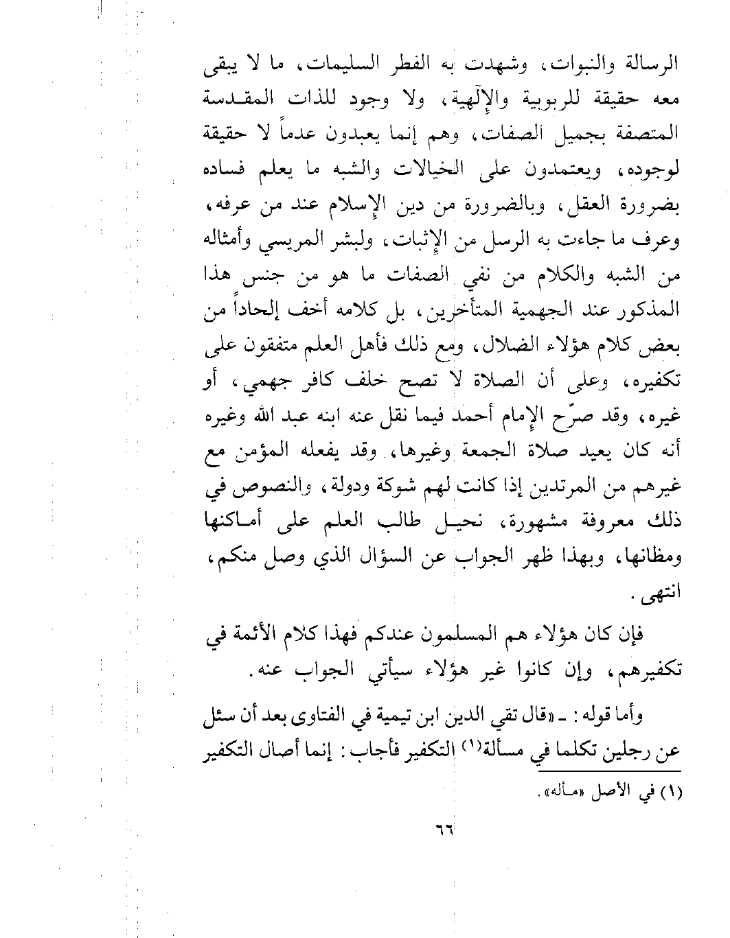 الرسالة والنبوات، وشهدت به الفطر السليمات، ما لا يبقى معه حقيقة للربوبية والإلهية، ولا وجود للذات المقدسة المتصفة بجميل الصفات، وهم إنما يعبدون عدماً لا حقيقة لوجوده، ويعتمدون على الخيالات والشبه ما يعلم فساده بضرورة العقل، وبالضرورة من دين الإسلام عند من عرفه، وعرف ما جاءت به الرسل من الإثبات، ولبشر المريسي وأمثاله من الشبه والكلام من نفي الصفات ما هو من جنس هذا المذكور عن الجهمية المتأخرين، بل كلامه أخف إلحاداً من بعض كلام هؤلاء الضلال، ومع ذلك فأهل العلم متفقون على تكفيره، وعلى أن الصلاة لا تصح خلف كافر جهمي، أو غيره، وقد صرّح الإمام أحمد فيما نقل عنه ابنه عبد الله وغيره أنه كان يعيد صلاة الجمعة وغيرها، وقد يفعله المؤمن مع غيرهم من المرتدين إذا كانت لهم شوكة ودولة، والنصوص في ذلك معروفة مشهورة، نحيل طالب العلم على أماكنها ومظانها، وبهذا ظهر الجواب عن السؤال الذي وصل منكم، انتهى.