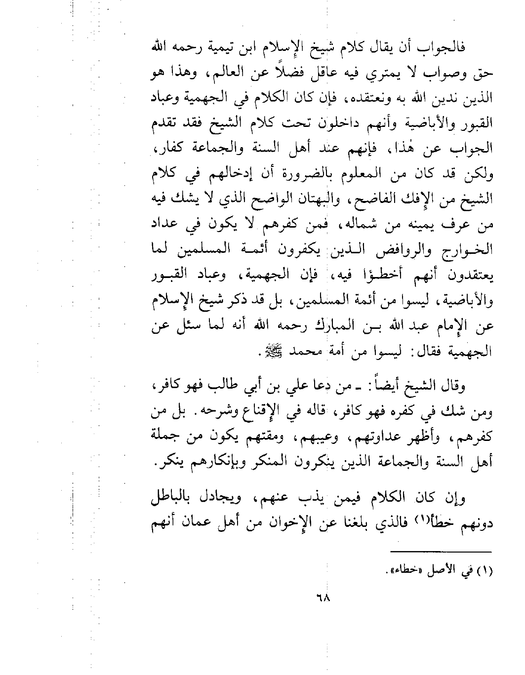 فالجواب أن يقال كلام شيخ الإسلام ابن تيمية رحمه الله حق وصواب لا يمتري فيه عاقل فضلاً عن العالم، وهذا هو الدين الذي ندين الله به ونعتقده، فإن كان الكلام في الجهمية وعباد القبور والأباضية وأنهم داخلون تحت كلام الشيخ فقد تقدم الجواب عن هذا، فإنهم عند أهل السنة والجماعة كفار، ولكن قد كان من المعلوم بالضرورة أن إدخالهم في كلام الشيخ من الإفك الفاضح، والبهتان الواضح، الذي لا يشك فيه من عرف يمينه من شماله، فمن كفرهم لا يكون في عداد الخوارج والروافض الذين يكفرون أئمة المسلمين لما يعتقدون أنهم أخطئوا فيه، فإن الجهمية، وعباد القبور، والأباضية، ليسوا من أئمة المسلمين، بل قد ذكر شيخ الإسلام عن الإمام عبد الله بن المبارك رحمه الله أنه لما سئل عن الجهمية فقال: ليسوا من أمة محمد صلى الله عليه وسلم.