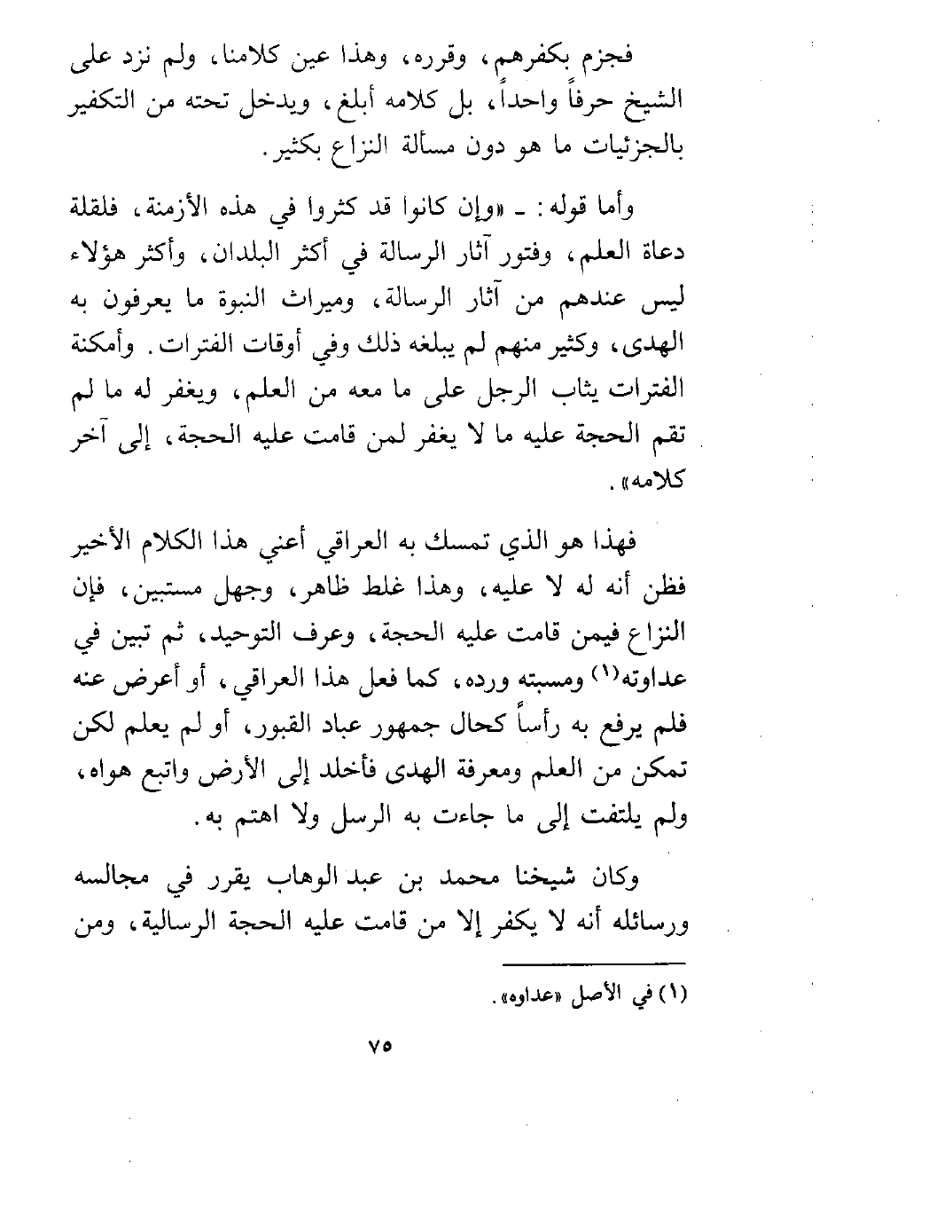 فهذا هو الذي تمسك به العراقي أعني هذا الكلام الأخير فظن أنه له لا عليه، وهذا غلط ظاهر، وجهل مستبين، فإن النزاع فيمن قامت عليه الحجة، وعرف التوحيد، ثم تبين في عداوته1 ومسبته ورده، كما فعل هذا العراقي، أو أعرض عنه فلم يرفع به رأساً كحال جمهور عباد القبور، أو لم يعلم لكن تمكن من العلم ومعرفة الهدى فأخلد إلى الأرض واتبع هواه، ولم يلتفت إلى ما جاءت به الرسل ولا اهتم به.