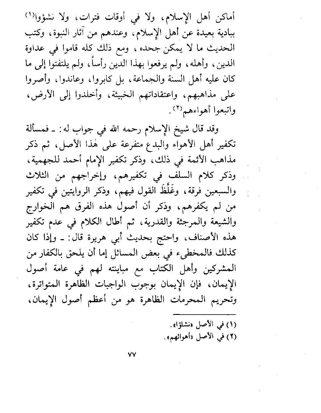 وقد قال شيخ الإسلام رحمه الله في جواب له: فمسألة تكفير أهل الأهواء والبدع متفرعة على هذا الأصل، ثم ذكر مذاهب الأئمة في ذلك، وذكر تكفير الإمام أحمد للجهمية، وذكر كلام السلف في تكفيرهم، وإخراجهم من الثلاث والسبعين فرقة، وغلّظ القول فيهم، وذكر الروايتين في تكفير من لم يكفرهم، وذكر أن أصول هذه الفرق هم الخوارج والشيعة والمرجئة والقدرية، ثم أطال الكلام في عدم تكفير هذه الأصناف، واحتج بحديث أبي هريرة قال: وإذا كان كذلك فالمخطئ في بعض المسائل إما أن يلحق بالكفار من المشركين وأهل الكتاب مع مباينته لهم في عامة أصول الإيمان، فإن الإيمان بوجوب الواجبات الظاهرة المتواترة، وتحريم المحرمات الظاهرة هو من أعظم أصول الإيمان،