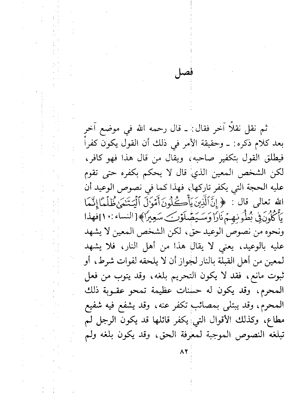 ثم نقل نقلاً آخر فقال: قال رحمه الله في موضع آخر بعد كلام ذكره: وحقيقة الأمر في ذلك أن القول يكون كفراً فيطلق القول بتكفير صاحبه، ويقال من قال هذا فهو كافر، لكن الشخص المعين الذي قال لا يحكم بكفره حتى تقوم عليه الحجة التي يكفر تاركها، فهذا كما في نصوص الوعيد أن الله تعالى قال: {إِنَّ الَّذِينَ يَأْكُلُونَ أَمْوَالَ الْيَتَامَى ظُلْماً إِنَّمَا يَأْكُلُونَ فِي بُطُونِهِمْ نَاراً وَسَيَصْلَوْنَ سَعِيراً} [النساء:10] .فهذا ونحوه من نصوص الوعيد حق، لكن الشخص المعين لا يشهد عليه بالوعيد، يعني لا يقال هذا من أهل النار، فلا يشهد لمعين من أهل القبلة بالنار لجواز أن لا يلحقه لفوات شرط، أو ثبوت مانع، فقد لا يكون التحريم بلغه، وقد يتوب من فعل المحرم، وقد يكون له حسنات عظيمة تمحو عقوبة ذلك المحرم، وقد يبتلى بمصائب تكفر عنه، وقد يشفع فيه شفيع مطاع، وكذلك الأقوال التي يكفر قائلها قد يكون الرجل لم تبلغه النصوص الموجبة لمعرفة الحق، وقد يكون بلغه ولم