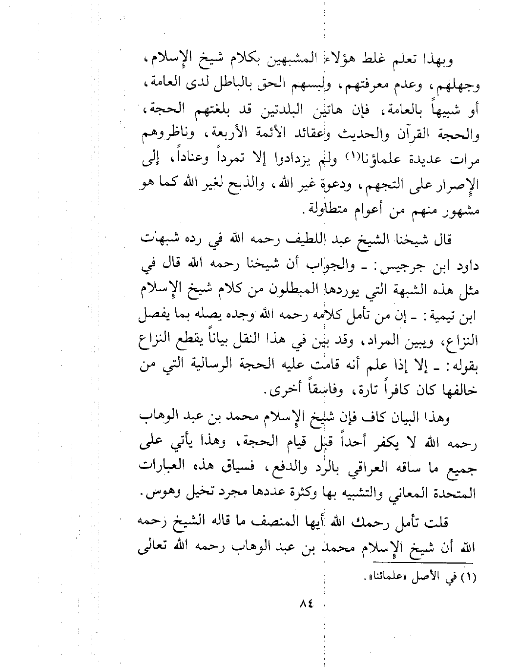 قال شيخنا الشيخ عبد اللطيف رحمه الله في رده شبهات داود ابن جرجيس: والجواب أن شيخنا رحمه الله قال في مثل هذه الشبه التي يوردها المبطلون من كلام شيخ الإسلام ابن تيمية: إن من تأمل كلامه رحمه الله وجده يصله بما يفصل النزاع ويبين المراد، وقد بين في هذا النقل بياناً يقطع النزاع بقوله: إلا إذا علم أنه قامت عليه الحجة الرسالية التي من خالفها كان كافراً تارة، وفاسقاً أخرى.