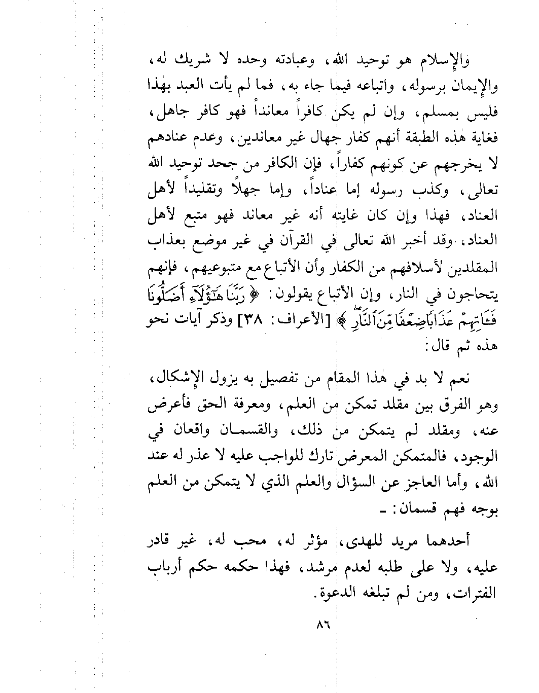 والإسلام هو توحيد الله، وعبادته وحده لا شريك له، والإيمان برسوله، وإتباعه فيما جاء به، فما لم يأت العبد بهذا فليس بمسلم، وإن لم يكن كافراً معانداً، وعدم عنادهم لا يخرجهم عن كونهم كفاراً، فإن الكافر من جحد توحيد الله تعالى، وكذب رسوله إما عناداً، وإما جهلاً وتقليداً لأهل العناد، فهذا وإن كان غايته أنه غير معاند فهو متبع لأهل العناد، وقد أخبر الله تعالى في القرآن في غير موضع بعذاب المقلدين لأسلافهم من الكفار وأن الأتباع مع متبوعيهم، فإنهم يتحاجون في النار، وإن الأتباع يقولون: {رَبَّنَا هَؤُلاءِ أَضَلُّونَا فَآتِهِمْ عَذَاباً ضِعْفاً مِنَ النَّارِ} [لأعراف: 38] . وذكر آيات نحو هذه ثم قال: