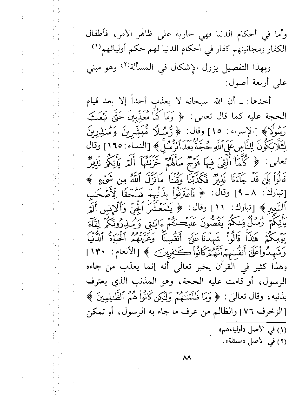 أحدها: أن الله سبحانه لا يعذب أحداً إلا بعد قيام الحجة عليه كما قال تعالى: {وَمَا كُنَّا مُعَذِّبِينَ حَتَّى نَبْعَثَ رَسُولاً} [الإسراء: 15] وقال: {رُسُلاً مُبَشِّرِينَ وَمُنْذِرِينَ لِئَلَّا يَكُونَ لِلنَّاسِ عَلَى اللَّهِ حُجَّةٌ بَعْدَ الرُّسُلِ} [النساء: 165] وقال تعالى: {كُلَّمَا أُلْقِيَ فِيهَا فَوْجٌ سَأَلَهُمْ خَزَنَتُهَا أَلَمْ يَأْتِكُمْ نَذِيرٌ * قَالُوا بَلَى قَدْ جَاءَنَا نَذِيرٌ فَكَذَّبْنَا وَقُلْنَا مَا نَزَّلَ اللَّهُ مِنْ شَيْءٍ} [الملك: 9:8] وقال: {فَاعْتَرَفُوا بِذَنْبِهِمْ فَسُحْقاً لِأَصْحَابِ السَّعِيرِ} [الملك:11] وقال: {يَا مَعْشَرَ الْجِنِّ وَالْأِنْسِ أَلَمْ يَأْتِكُمْ رُسُلٌ مِنْكُمْ يَقُصُّونَ عَلَيْكُمْ آيَاتِي وَيُنْذِرُونَكُمْ لِقَاءَ يَوْمِكُمْ هَذَا قَالُوا شَهِدْنَا عَلَى أَنْفُسِنَا وَغَرَّتْهُمُ الْحَيَاةُ الدُّنْيَا وَشَهِدُوا عَلَى أَنْفُسِهِمْ أَنَّهُمْ كَانُوا كَافِرِينَ} [الأنعام:130] وهذا كثيرا في القرآن يخبر تعالى أنه إنما يعذب من جاءه الرسول أو قامت عليه الحجة، وهو المذنب الذي يعترف بذنبه، وقد قال تعالى: {وَمَا ظَلَمْنَاهُمْ وَلَكِنْ كَانُوا هُمُ الظَّالِمِينَ} [الزخرف:76] والظالم من عرف ما جاء به الرسول، أو تمكن