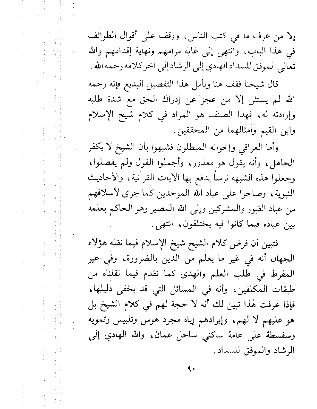 فتبين أن فرض كلام الشيخ شيخ الإسلام فيما نقله هؤلاء الجهال أنه في غير ما يعلم من الدين بالضرورة، وفي غير المفرط في طلب العلم والهدى وكما تقدم فيما نقلناه من طبقات المكلفين، وأنه في المسائل التي قد يخفى دليلها، فإذا عرفت هذا تبين لك أنه لا حجة لهم في كلام الشيخ بل هو عليهم لا لهم، وإيرادهم إياه مجرد هوس وتلبيس وتمويه وسفسطة على عامة ساكني ساحل عمان. والله الهادي إلى الرشاد والموفق للسداد.