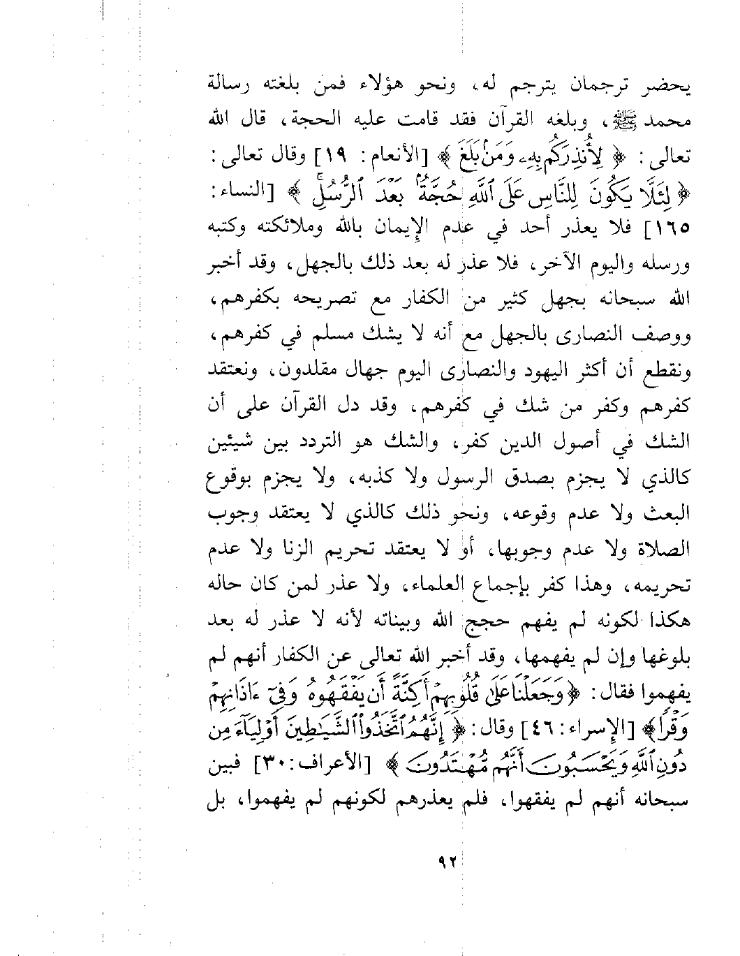 يحضر ترجمان يترجم له، ونحو هؤلاء فمن بلغته رسالة محمد صلى الله عليه وسلم، وبلغه القرآن فقد قامت عليه الحجة، قال الله تعالى: {لِأُنْذِرَكُمْ بِهِ وَمَنْ بَلَغَ} [الأنعام: 19] وقال تعالى: {لِئَلَّا يَكُونَ لِلنَّاسِ عَلَى اللَّهِ حُجَّةٌ بَعْدَ الرُّسُلِ ً} [النساء: 165] فلا يعذر أحد في عدم الإيمان بالله وملائكته وكتبه ورسله واليوم الآخر، فلا عذر له بعد ذلك بالجهل، وقد أخبر الله سبحانه بجهل كثير من الكفار مع تصريحه بكفرهم، ووصف النصارى بالجهل مع أنه لا يشك مسلم في كفرهم، ونقطع أن أكثر اليهود والنصارى اليوم جهال مقلدون، ونعتقد كفرهم وكفر من شك في كفرهم، وقد دل القرآن على أن الشك في أصول الدين كفر، والشك هو التردد بين شيئين كالذي لا يجزم بصدق الرسول ولا كذبه، ولا يجزم بوقوع البعث ولا عدم وقوعه، ونحو ذلك كالذي لا يعتقد وجوب الصلاة ولا عدم وجوبها، أو لا يعتقد تحريم الزنا ولا عدم تحريمه، وهذا كفر بإجماع العلماء، ولا عذر لمن كان حاله هكذا لكونه لم يفهم حجج الله وبيناته لأنه لا عذر له بعد بلوغها لكونه لم يفهمها، وقد أخبر الله تعالى عن الكفار أنهم يفهموا فقال: {وَجَعَلْنَا عَلَى قُلُوبِهِمْ أَكِنَّةً أَنْ يَفْقَهُوهُ وَفِي آذَانِهِمْ وَقْرا} [الأنعام: 25] وقال: {إِنَّهُمُ اتَّخَذُوا الشَّيَاطِينَ أَوْلِيَاءَ مِنْ دُونِ اللَّهِ وَيَحْسَبُونَ أَنَّهُمْ مُهْتَدُونَ} [لأعراف: 30] فبين سبحانه أنهم لم يفقهوا، فلم يعذرهم لكونهم لم يفهموا، بل