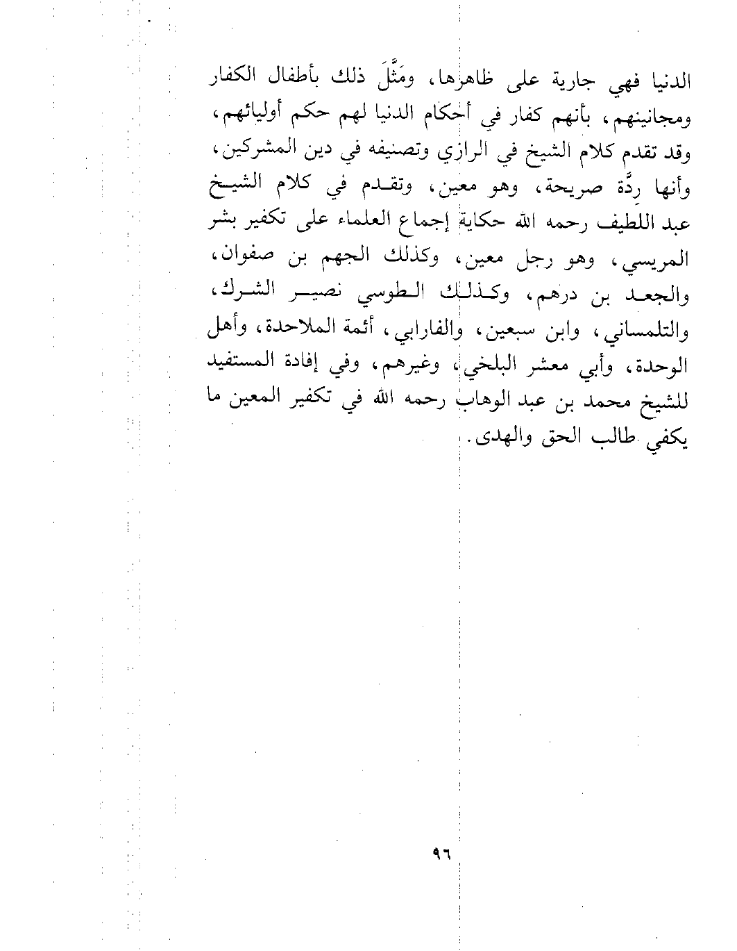 الدنيا فهي جارية على ظاهرها، ومَثَّلَ ذلك بأطفال الكفار ومجانينهم، بأنهم كفار في أحكام الدنيا لهم حكم أوليائهم، وقد تقدم كلام الشيخ في الرازي وتصنيفه في دين المشركين، وأنها رِدَّة صريحة، وهو معين، وتقدم في كلام الشيخ عبد اللطيف رحمه الله حكاية إجماع العلماء على تكفير بشر المريسي، وهو رجل معين، وكذلك الجهم بن صفوان، والجعد بن درهم، وكذلك الطوسي نصير الشرك، والتلمساني، وابن سبعين، والفارابي، أئمة الملاحدة، وأهل الوحدة، وأبي معشر البلخي، وغيرهم وفي إفادة المستفيد للشيخ محمد بن عبد الوهاب رحمه الله في تكفير المعين ما يكفي طالب الحق والهدى.