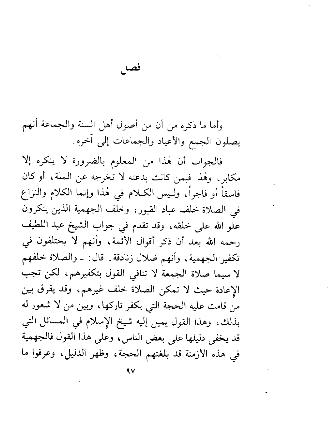 فالجواب: أن هذا من المعلوم بالضرورة لا ينكره إلا مكابر، وهذا فيمن كانت بدعته لا تخرجه عن الملة، أو كان فاسقاً أو فاجراً، وليس الكلام في هذا وإنما الكلام والنزاع في الصلاة خلف عباد القبور، وخلف الجهمية الذين ينكرون علو الله على خلقه، وقد تقدم في جواب الشيخ عبد اللطيف رحمه الله بعد أن ذكر أقوال الأئمة، وأنهم لا يختلفون في تكفير الجهمية، وأنهم ضلال زنادقة. قال: والصلاة خلفهم لا سيما صلاة الجمعة لا تنافي القول بتكفيرهم، لكن تجب الإعادة حيث لا تمكن الصلاة خلف غيرهم، وقد يفرق بين من قامت عليه الحجة التي يكفر تاركها، وبين من لا شعور له بذلك، وهذا القوم يميل إليه شيخ الإسلام في المسائل التي قد يخفى دليلها على بعض الناس، وعلى هذا القول فالجهمية في هذه الأزمنة قد بلغتهم الحجة، وظهر الدليل، وعرفوا ما