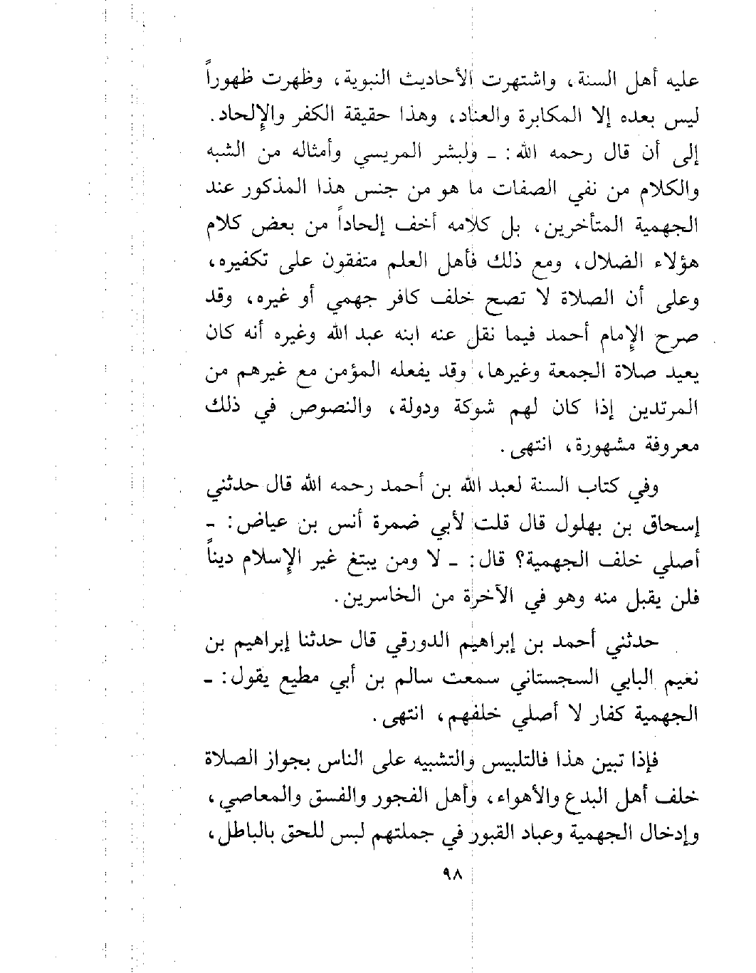 عليه أهل السنة، واشتهرت الأحاديث النبوية، وظهرت ظهوراً ليس بعده إلا المكابرة والعناد، وهذا حقيقة الكفر والإلحاد. إلى أن قال رحمه الله: ولبشر المريسي وأمثاله من الشبه والكلام من نفي الصفات ما هو من جنس هذا المذكور عند الجهمية المتأخرين، بل كلامه أخف إلحاداً من بعض كلام هؤلاء الضلال، ومع ذلك فأهل العلم متفقون على تكفيرهم، وعلى أن الصلاة لا تصح خلف كافر جهمي أو غيره، وقد صرح الإمام أحمد فيما نقل عنه ابن عبد الله وغيره أنه كان يعيد صلاة الجمعة وغيرها، وقد يفعله المؤمن مع غيرهم من المرتدين إذا كان لهم شوكة ودولة، والنصوص في ذلك معروفة مشهورة، انتهى.