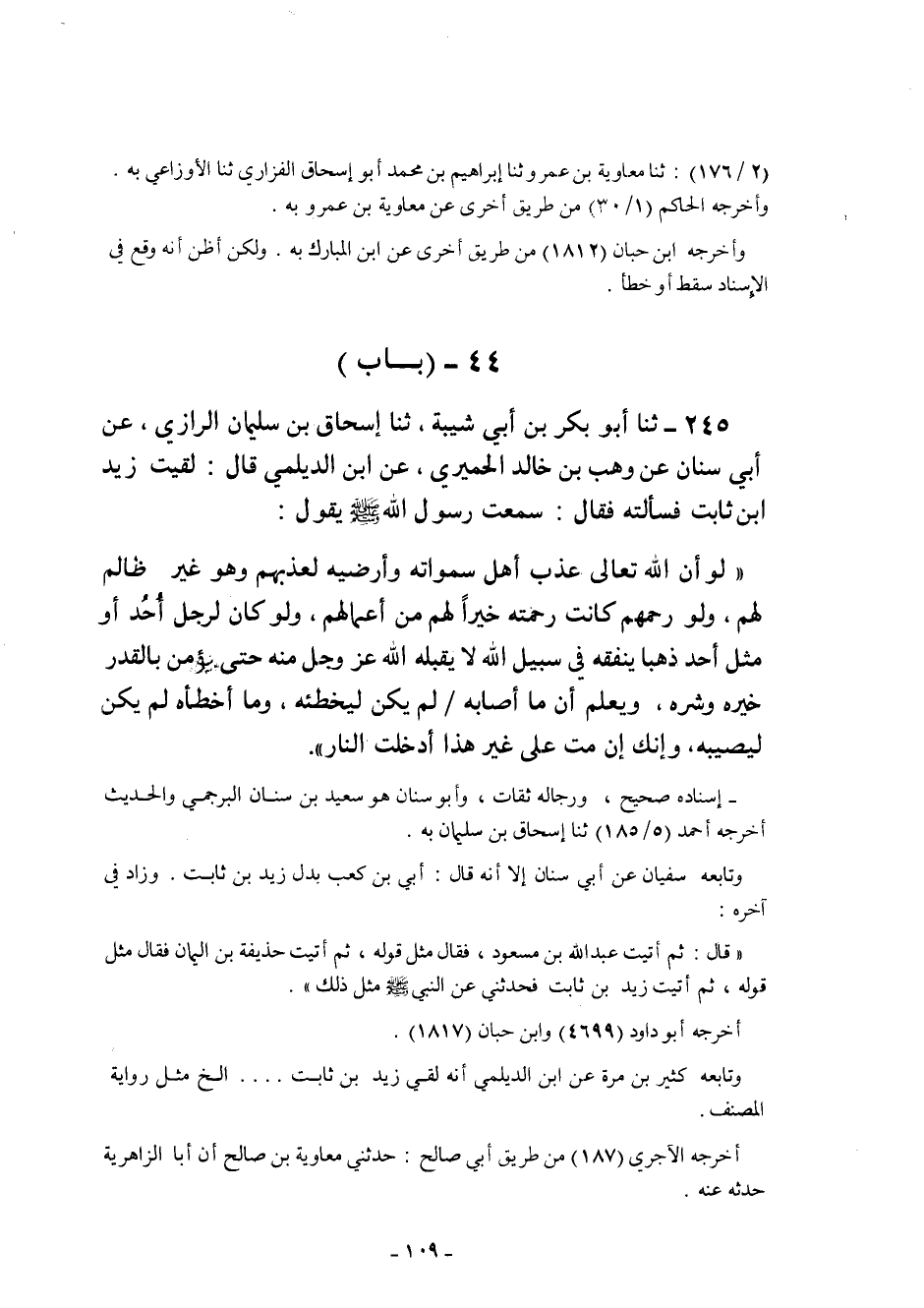 245- ثنا أَبُو بَكْرِ بْنُ أَبِي شَيْبَةَ ثنا إِسْحَاقُ بْنُ سُلَيْمَانَ الرَّازِيُّ عَنْ أَبِي سِنَانٍ عَنْ وَهْبِ بْنِ خَالِدٍ الْحِمْيَرِيِّ عَنِ ابْنِ الدَّيْلَمِيِّ قَالَ لَقِيتُ زيد ابن ثَابِتٍ فَسَأَلْتُهُ فَقَالَ: سَمِعْتُ رَسُولَ اللَّهِ صَلَّى اللَّهُ عَلَيْهِ وَسَلَّمَ يَقُولُ:
