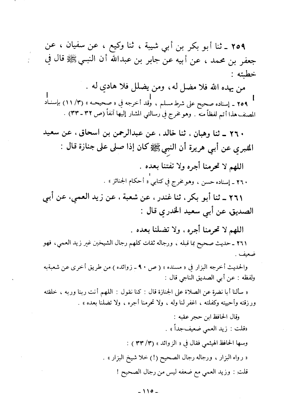 259- ثنا أَبُو بَكْرِ بْنُ أَبِي شَيْبَةَ ثنا وَكِيعٌ عَنْ سُفْيَانَ عَنْ جَعْفَرِ بْنِ مُحَمَّدٍ عَنْ أبيه عن جابر ابن عبد الله أَنّ النَّبِيَّ صَلَّى اللَّهُ عَلَيْهِ وَسَلَّمَ قَالَ فِي خُطْبَتِهِ: