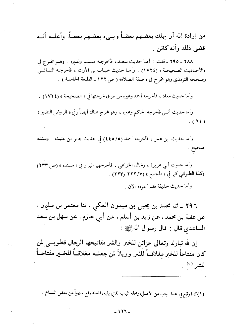 288- 295- قلت أما حديث سعد فأخرجه مسلم وغيره وهو مخرج في "الأحاديث الصحيحة". وأما حديث خباب بن الأرت فأخرجه النسائي وصححه الترمذي وهو مخرج في صفة الصلاة ص 122 - الطبعة الخامسة.