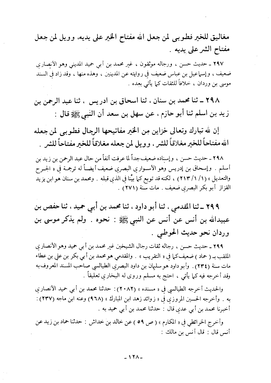 297- حديث حسن ورجاله موثقون غير مُحَمَّدِ بْنِ أَبِي حُمَيْدٍ الْمَدِينِيِّ وهو الأنصاري ضعيف وإسماعيل بن عباس ضعيف في روايته عن المدينين وهذه منها وقد زاد في السند موسى بن وردان خلافا للثقات كما يأتي بعده.