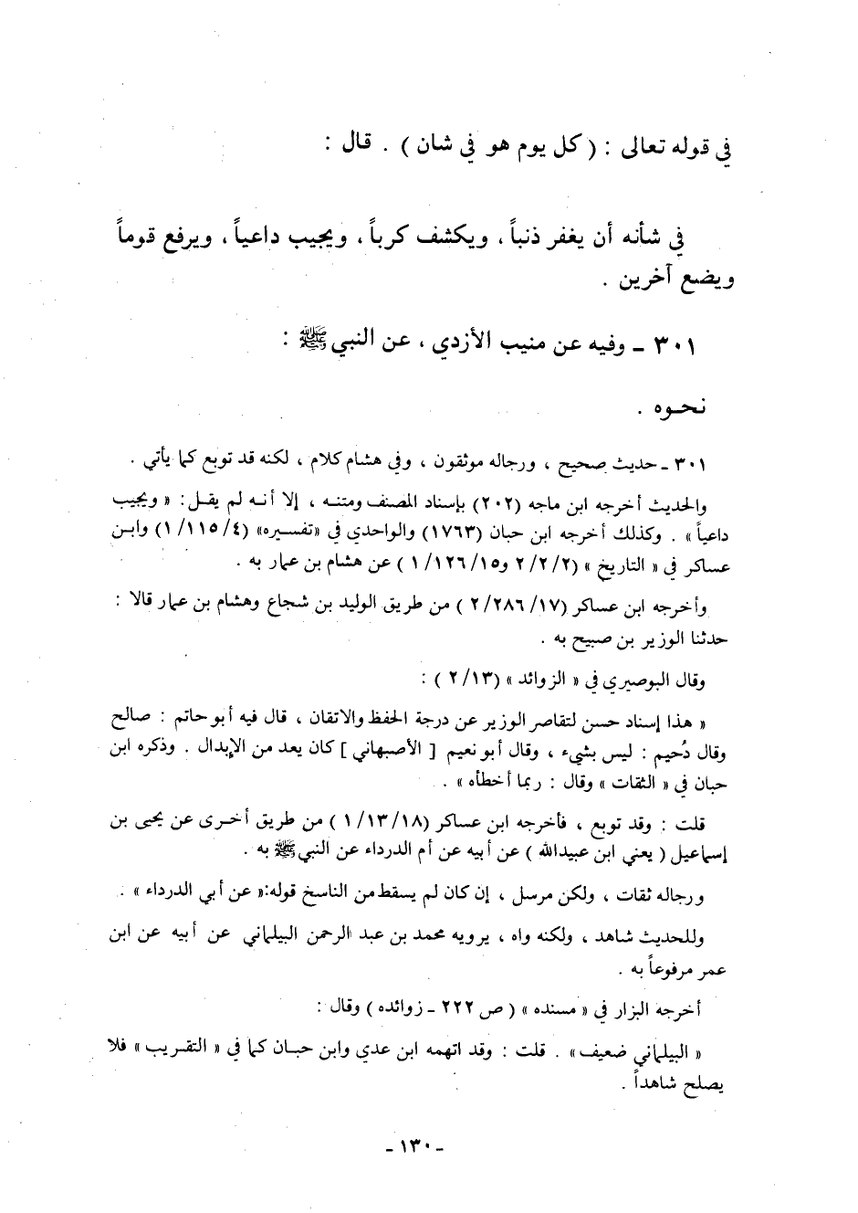 301- ثنا هِشَامُ بْنُ عَمَّارٍ ثنا الوزير بن صبيح حدثنا يُونُسُ بْنُ مَيْسَرَةَ بْنِ حَلْبَسٍ عَنْ أُمِّ الدَّرْدَاءِ عَنْ أَبِي الدَّرْدَاءِ قَالَ: قَالَ رَسُولُ اللَّهِ صَلَّى اللَّهُ عَلَيْهِ وَسَلَّمَ: فِي قَوْلِهِ تَعَالَى: {كُلَّ يَوْمٍ هُوَ فِي شَأْنٍ} . قَالَ:
