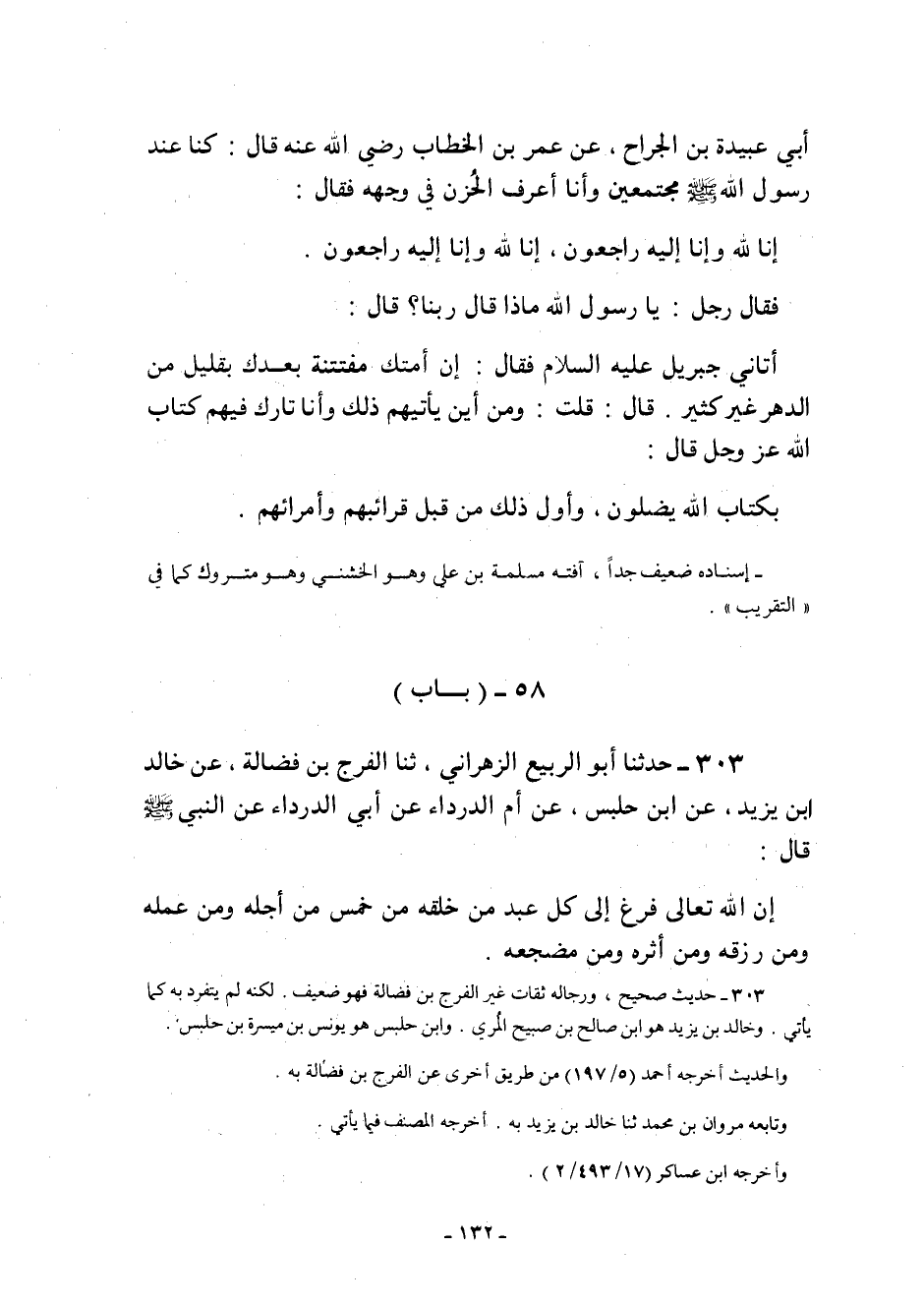 303- ثنا يَعْقُوبُ بْنُ كَعْبٍ الأَنْطَاكِيُّ ثنا مُحَمَّدُ بْنُ حِمْيَرٍ عن مسلمة ابن عُلَيٍّ عَنْ عُمَرَ بْنِ ذَرٍّ عن أبي كلابة عَنْ أَبِي مُسْلِمٍ الْخَوْلانِيِّ عَنْ أَبِي عُبَيْدَةَ بْنِ الْجَرَّاحِ عَنْ عُمَرَ بْنِ الْخَطَّابِ رَضِيَ اللَّهُ عَنْهُ قَالَ: كُنَّا عِنْدَ رَسُولِ اللَّهِ صَلَّى اللَّهُ عَلَيْهِ وَسَلَّمَ مُجْتَمِعِينَ وَأَنَا أَعْرِفُ الْحُزْنَ فِي وَجْهِهِ فَقَالَ: