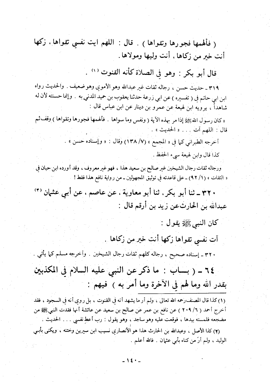 320- ثنا أَبُو بَكْرٍ ثنا أَبُو مُعَاوِيَةَ عَنْ عَاصِمٍ عَنْ أَبِي عُثْمَانَ2 عَبْدِ اللَّهِ بْنِ الْحَارِثِ عَنْ زَيْدِ بْنِ أَرْقَمَ قَالَ: كَانَ النَّبِيُّ صَلَّى اللَّهُ عَلَيْهِ وَسَلَّمَ يَقُولُ: "آتِ نَفْسِي تَقْوَاهَا زَكِّهَا أَنْتَ خَيْرُ مَنْ زَكَّاهَا".