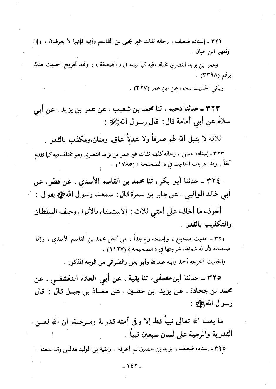 323- حَدَّثَنَا دُحَيْمٌ ثنا مُحَمَّدُ بْنُ شُعَيْبٍ عَنْ عُمَرَ بْنِ يَزِيدَ عَنْ أَبِي سَلامٍ عَنْ أَبِي أُمَامَةَ قَالَ: قَالَ رَسُولُ اللَّهِ صَلَّى اللَّهُ عَلَيْهِ وَسَلَّمَ:
