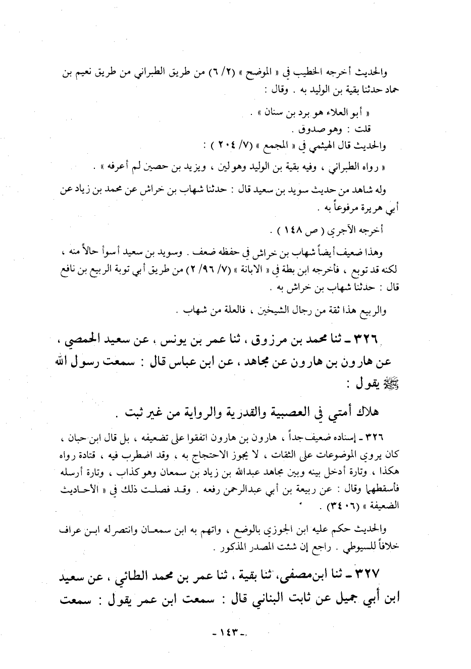 327 - ثنا ابْنُ مُصَفَى ثنا بَقِيَّةُ ثنا عُمَرُ بْنُ مُحَمَّدٍ الطَّائِيُّ عن سعيد ابن أَبِي جَمِيلٍ عَنْ ثَابِتٍ الْبُنَانِيِّ قَالَ: سَمِعْتُ ابْنَ عُمَرَ يَقُولُ: سَمِعْتُ