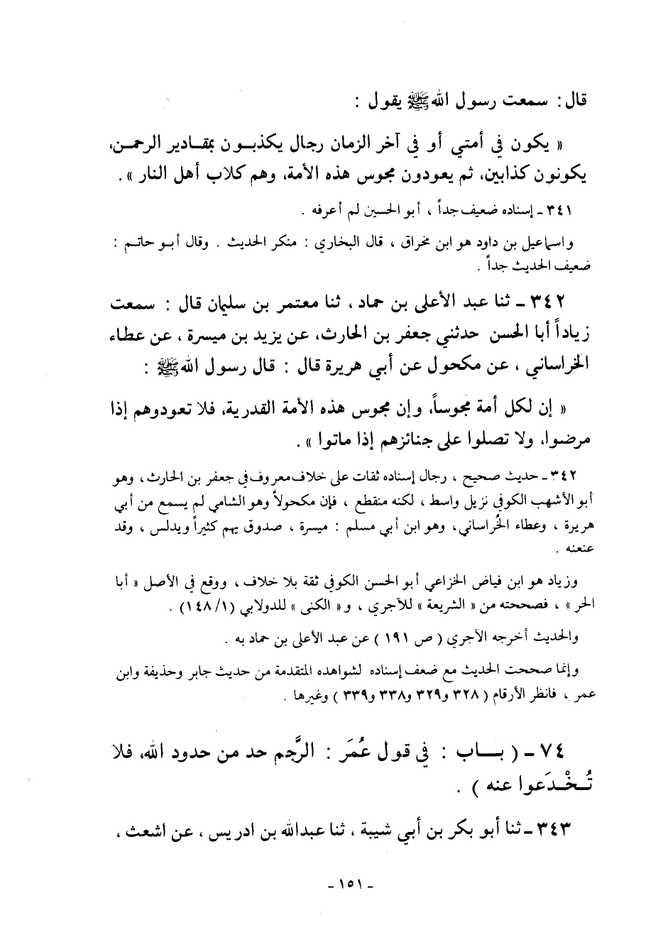 "إِنَّ لِكُلِّ أُمَّةٍ مَجُوسًا وَإِنَّ مَجُوسَ هَذِهِ الأُمَّةِ الْقَدَرِيَّةُ فَلا تَعُودُوهُمْ إِذَا مَرِضُوا وَلا تُصَلُّوا عَلَى جَنَائِزِهِمْ إِذَا مَاتُوا".