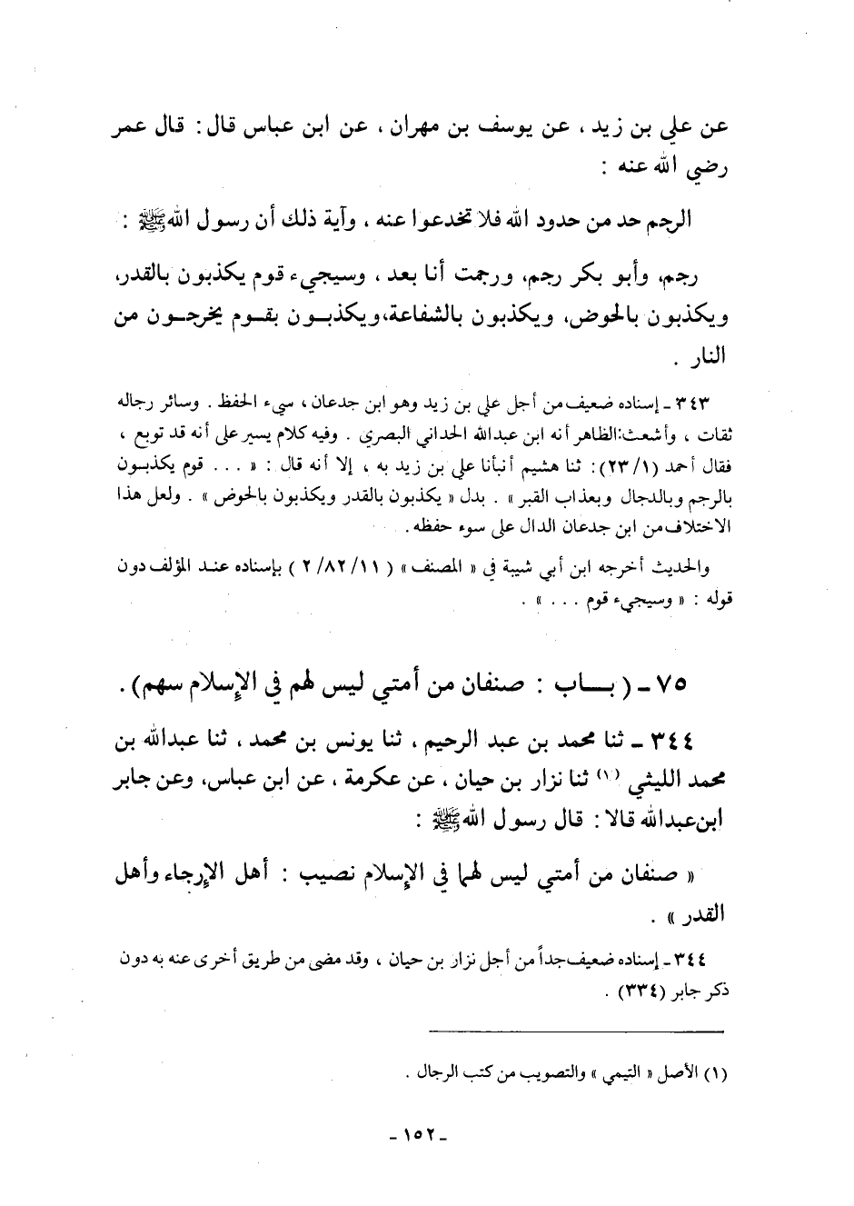 343- إسناده ضعيف من أجل علي بن زيد وهو ابن جدعان شيء الحفظ وساذر رجاله ثقات وأشعث الظاهر أنه ابن عبد الله الحداني البصري. وفيه كلام يسير علي أنه قد توبع فقال أحمد 1/23: ثنا هشيم أنبأنا علي بن زيد به إلا أنه قال: ... قوم يكذبون بالرجم وبالدجال وبعذاب القبر بدل يكذبون بالقدر ويكذبون بالحوض. ولعل هذا الاختلاف من ابن جدعان الدال علي سوء حفظه.