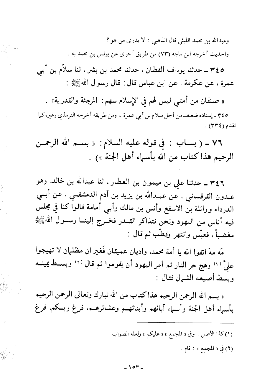 "بِسْمِ اللَّهِ الرَّحْمَنِ الرَّحِيمِ هَذَا كِتَابٌ مِنَ اللَّهِ تَبَارَكَ وَتَعَالَى الرَّحْمَنِ الرَّحِيمِ بِأَسْمَاءِ أَهْلِ الْجَنَّةِ وَأَسْمَاءِ آبَائِهِمْ وَأَبْنَائِهِمْ وَعَشَائِرِهِمْ فرغ ربكم فرغ
