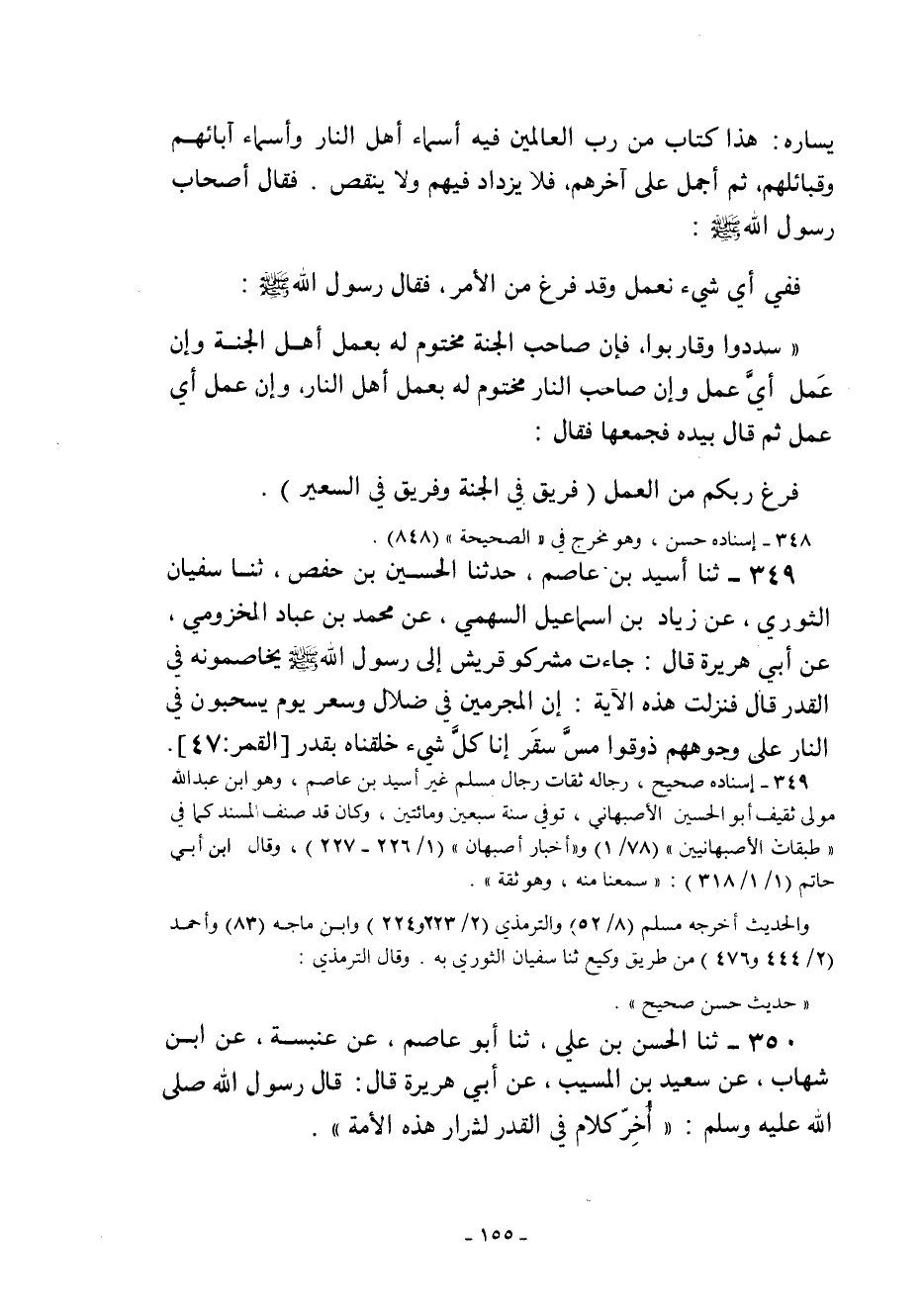 350 - ثنا الْحَسَنُ بْنُ عَلِيٍّ ثنا أَبُو عَاصِمٍ عَنْ عَنْبَسَةَ عَنِ ابْنِ شِهَابٍ عَنْ سَعِيدِ بْنِ الْمُسَيِّبِ عَنْ أَبِي هُرَيْرَةَ قَالَ: قَالَ رَسُولُ اللَّهِ صَلَّى اللَّهُ عَلَيْهِ وَسَلَّمَ: "أُخِّرَ كَلامٌ فِي القدر لشرار هذه الأمة".