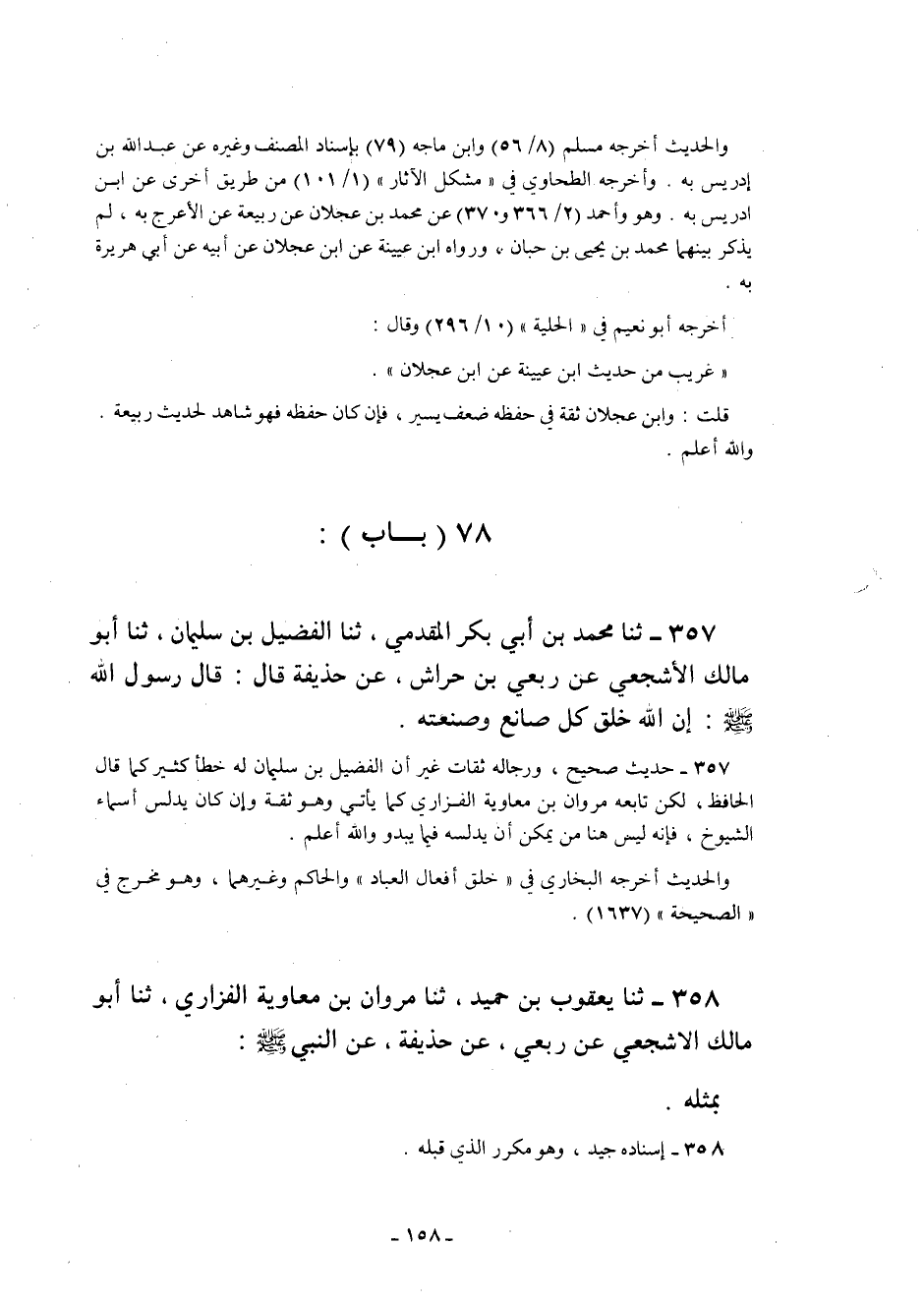 357- ثنا مُحَمَّدُ بْنُ أَبِي بَكْرٍ الْمُقَدَّمِيُّ ثنا الْفُضَيْلُ بْنُ سُلَيْمَانَ ثنا أَبُو مَالِكٍ الأَشْجَعِيُّ عن ربعي ابن حِرَاشٍ عَنْ حُذَيْفَةَ قَالَ: قَالَ رَسُولُ اللَّهِ صَلَّى اللَّهُ عَلَيْهِ وَسَلَّمَ: "إِنَّ اللَّهَ خَلَقَ كُلَّ صانع وصنعته".