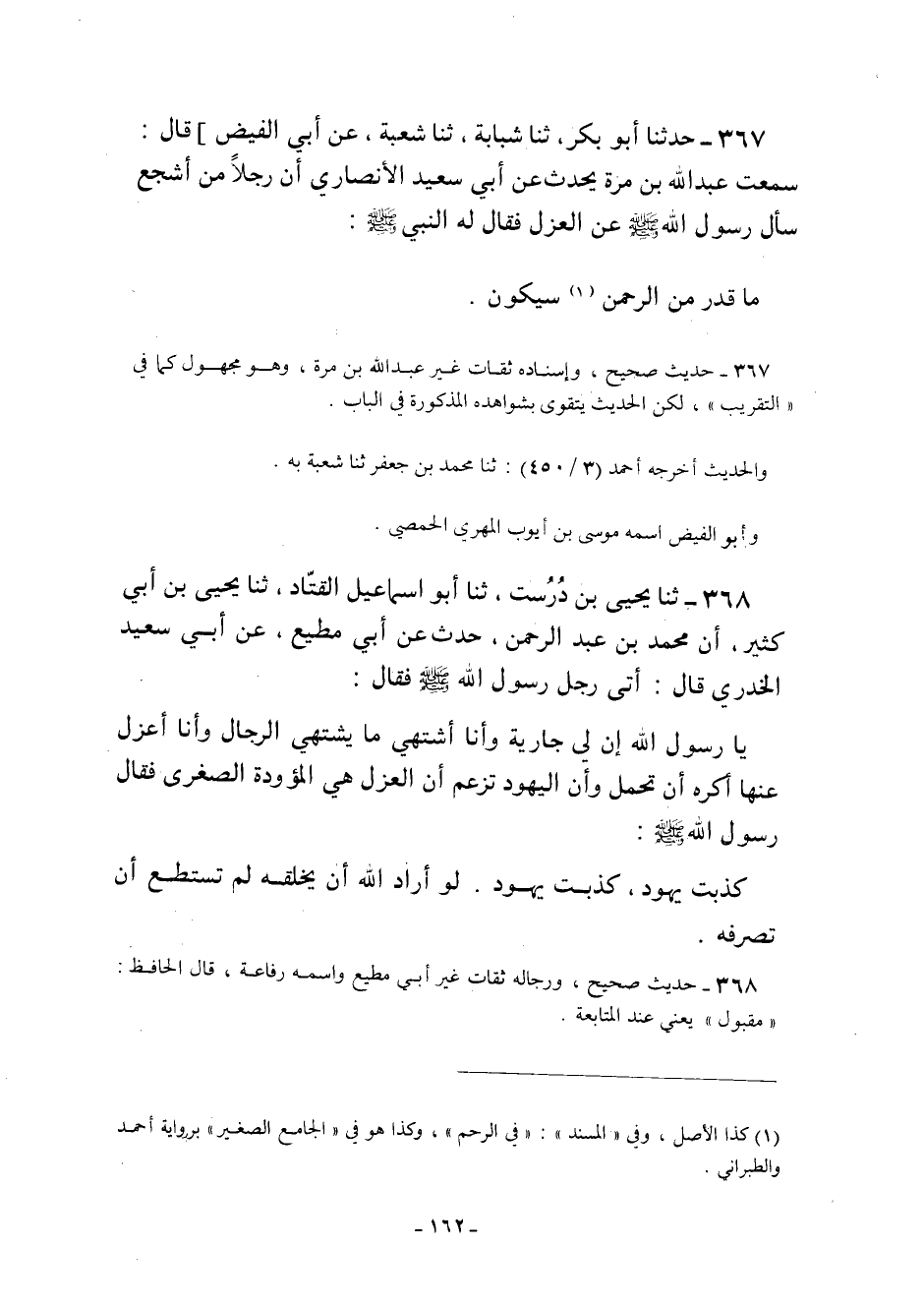 367- حَدَّثَنَا أَبُو بَكْرٍ ثنا شَبَابَةُ ثنا شُعْبَةُ عَنْ أَبِي الْفَيْضِ قَالَ: سَمِعْتُ عَبْدَ اللَّهِ بْنَ مُرَّةَ يُحَدِّثُ عَنْ أَبِي سَعِيدٍ الأَنْصَارِيِّ أَنَّ رَجُلا مِنْ أَشْجَعَ سَأَلَ رَسُولَ اللَّهِ صَلَّى اللَّهُ عَلَيْهِ وَسَلَّمَ عَنِ الْعَزْلِ فَقَالَ لَهُ النَّبِيُّ صَلَّى اللَّهُ عَلَيْهِ وَسَلَّمَ: