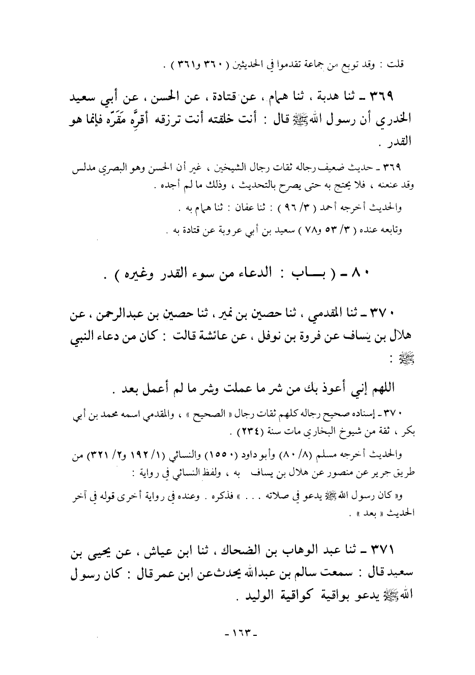 369- ثنا هُدْبَةُ ثنا هَمَّامٌ عَنْ قَتَادَةَ عَنِ الْحَسَنِ عَنْ أَبِي سَعِيدٍ الْخُدْرِيِّ أَنّ رَسُولَ اللَّهِ صَلَّى اللَّهُ عَلَيْهِ وَسَلَّمَ قَالَ: "أَنْتَ خَلَقْتَهُ أَنْتَ تَرْزُقُهُ أَقِرَّهُ مقره فإنما هو القدر".
