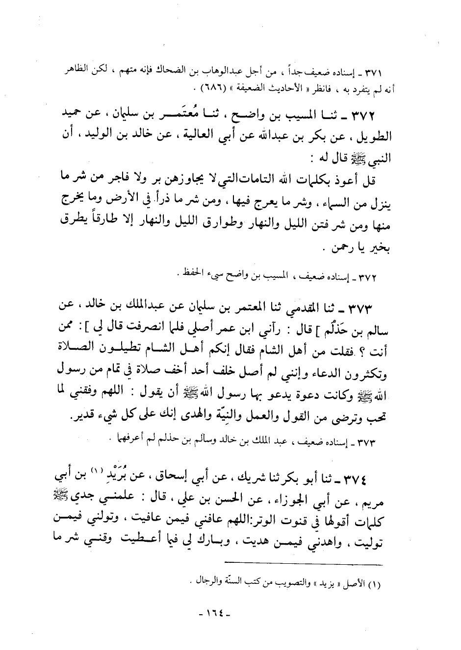 374- ثنا أَبُو بَكْرٍ ثنا شَرِيكٌ عَنْ أَبِي إِسْحَاقَ عَنْ بُرَيْدِ1 بْنِ أَبِي مَرْيَمَ عَنْ أَبِي الْجَوْزَاءِ عَنِ الْحَسَنِ بْنِ عَلِيٍّ قَالَ: عَلَّمَنِي جَدِّي صَلَّى اللَّهُ عَلَيْهِ وَسَلَّمَ كَلِمَاتٍ أَقُولُهَا فِي قُنُوتِ الْوِتْرِ: "اللَّهُمَّ عَافِنِي فِيمَنْ عَافَيْتَ وَتَوَلَّنِي فِيمَنْ تَوَلَّيْتَ وَاهْدِنِي فِيمَنْ هَدَيْتَ وَبَارِكْ لِي فِيمَا أعطيت وقني شر ما