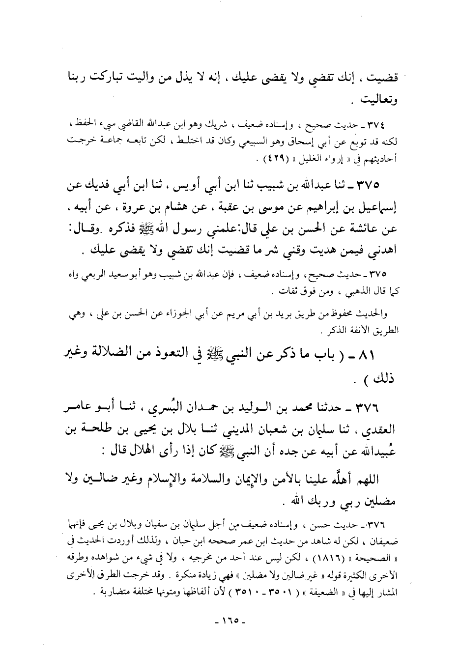 376- حديث حسن وإسناده ضعيف من أجل سليمان بن سفيان وبلال بن يحيى فإنهما ضعيفان لكن له شاهد من حديث ابن عمر صححه ابن حبان ولذلك أوردت الحديث في "الصحيحة" 1816 لكن ليس عند أحد من مخرجيه ولا في شيء من شواهده وطرقه الأخرى الكثيرة قوله: "غير ضالين ولا مضلين" فهي زيادة منكرة. وقد خرجت الطرق الأخرى المشار إليها في "الضعيفة" 3501-3510 لأن ألفاظها ومتونها مختلفة متضاربة.