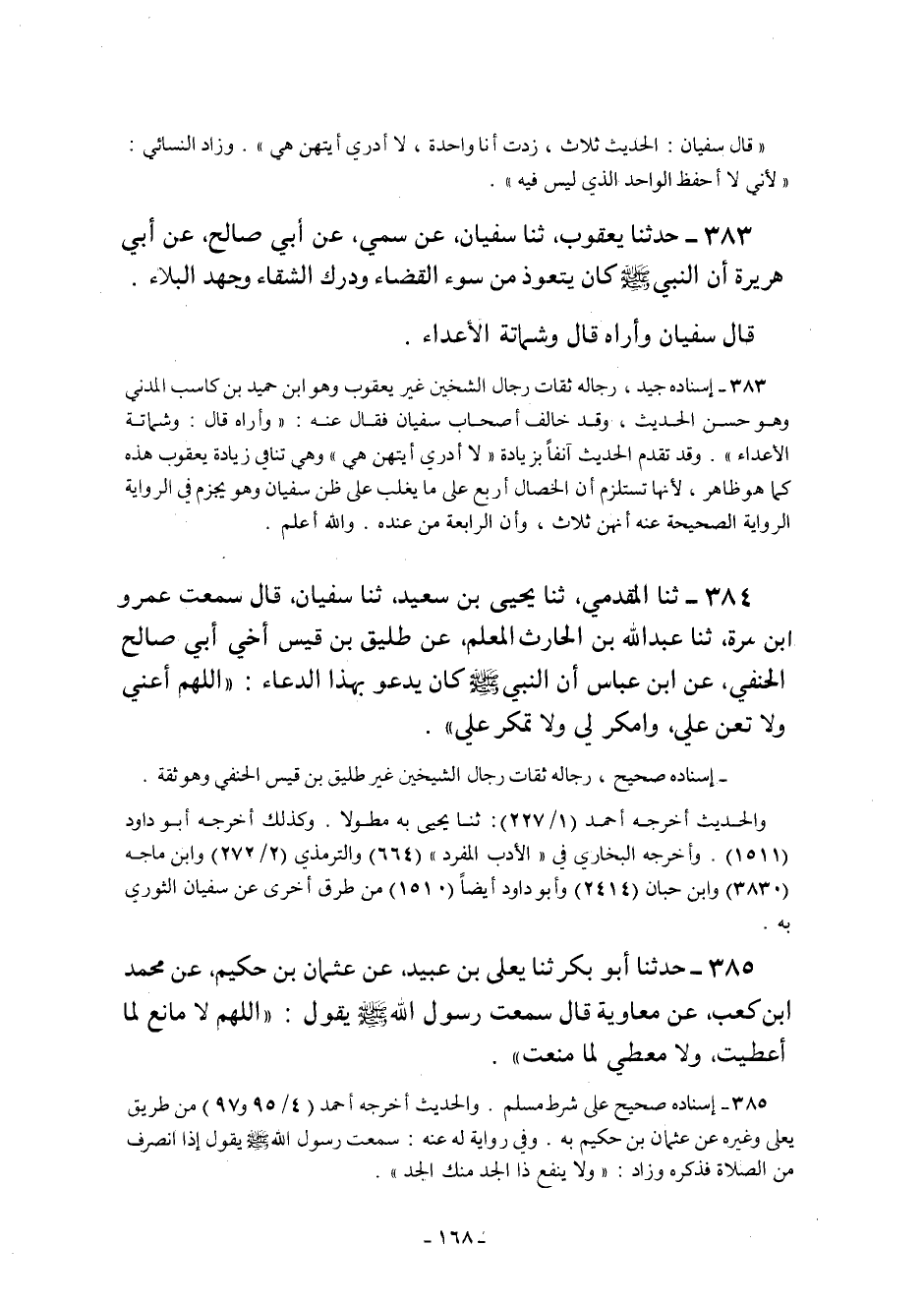 384- ثنا الْمُقَدَّمِيُّ ثنا يَحْيَى بْنُ سَعِيدٍ ثنا سُفْيَانُ قَالَ سَمِعْتُ عمرو ابن مُرَّةَ ثنا عَبْدُ اللَّهِ بْنُ الْحَارِثِ الْمُعَلِّمُ عَنْ طَلِيقِ بْنِ قَيْسٍ أَخِي أَبِي صَالِحٍ الْحَنَفِيِّ عَنِ ابْنِ عَبَّاسٍ أَنّ النَّبِيَّ صَلَّى اللَّهُ عَلَيْهِ وَسَلَّمَ كَانَ يَدْعُو بِهَذَا الدُّعَاءِ: "اللَّهُمَّ أَعِنِّي وَلا تُعِنْ عَلَيَّ وَامْكُرْ لِي ولا تمكر علي".