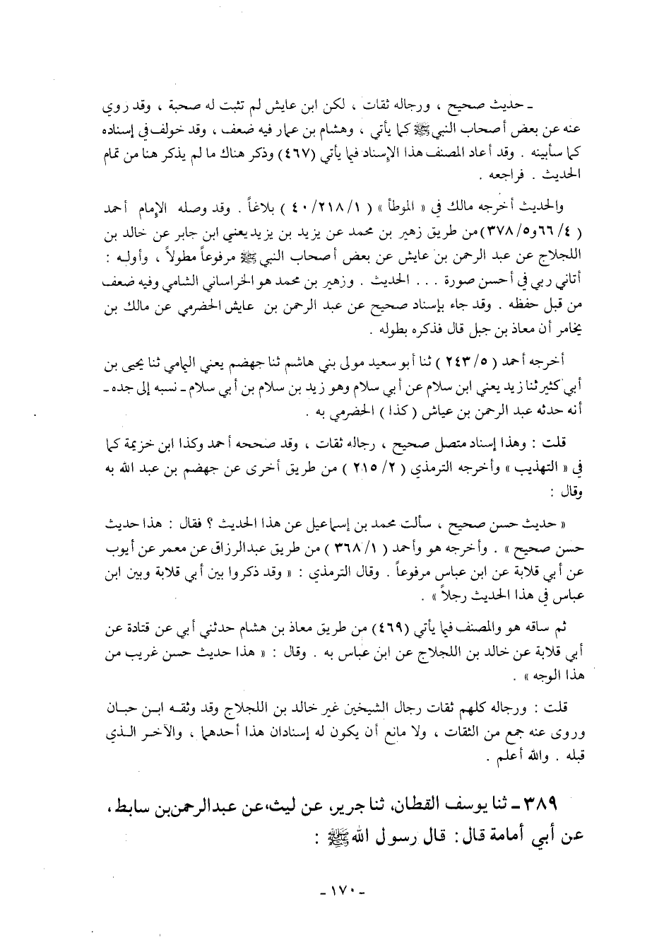 389- ثنا يُوسُفُ الْقَطَّانُ ثنا جَرِيرٌ عَنْ لَيْثٍ عَنْ عَبْدِ الرَّحْمَنِ بْنِ سَابِطٍ عَنْ أَبِي أُمَامَةَ قَالَ: قَالَ رَسُولُ اللَّهِ صَلَّى اللَّهُ عَلَيْهِ وَسَلَّمَ:
