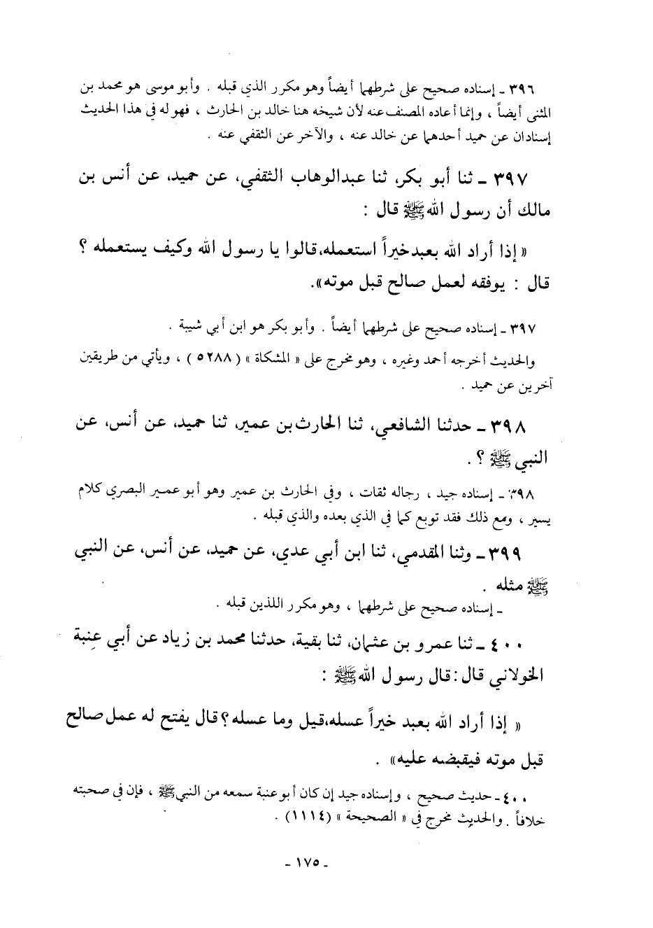 397- ثنا أَبُو بَكْرٍ ثنا عَبْدُ الْوَهَّابِ الثَّقَفِيُّ عَنْ حُمَيْدٍ عَنْ أَنَسِ بْنِ مَالِكٍ أَنّ رَسُولَ اللَّهِ صَلَّى اللَّهُ عَلَيْهِ وَسَلَّمَ قَالَ: