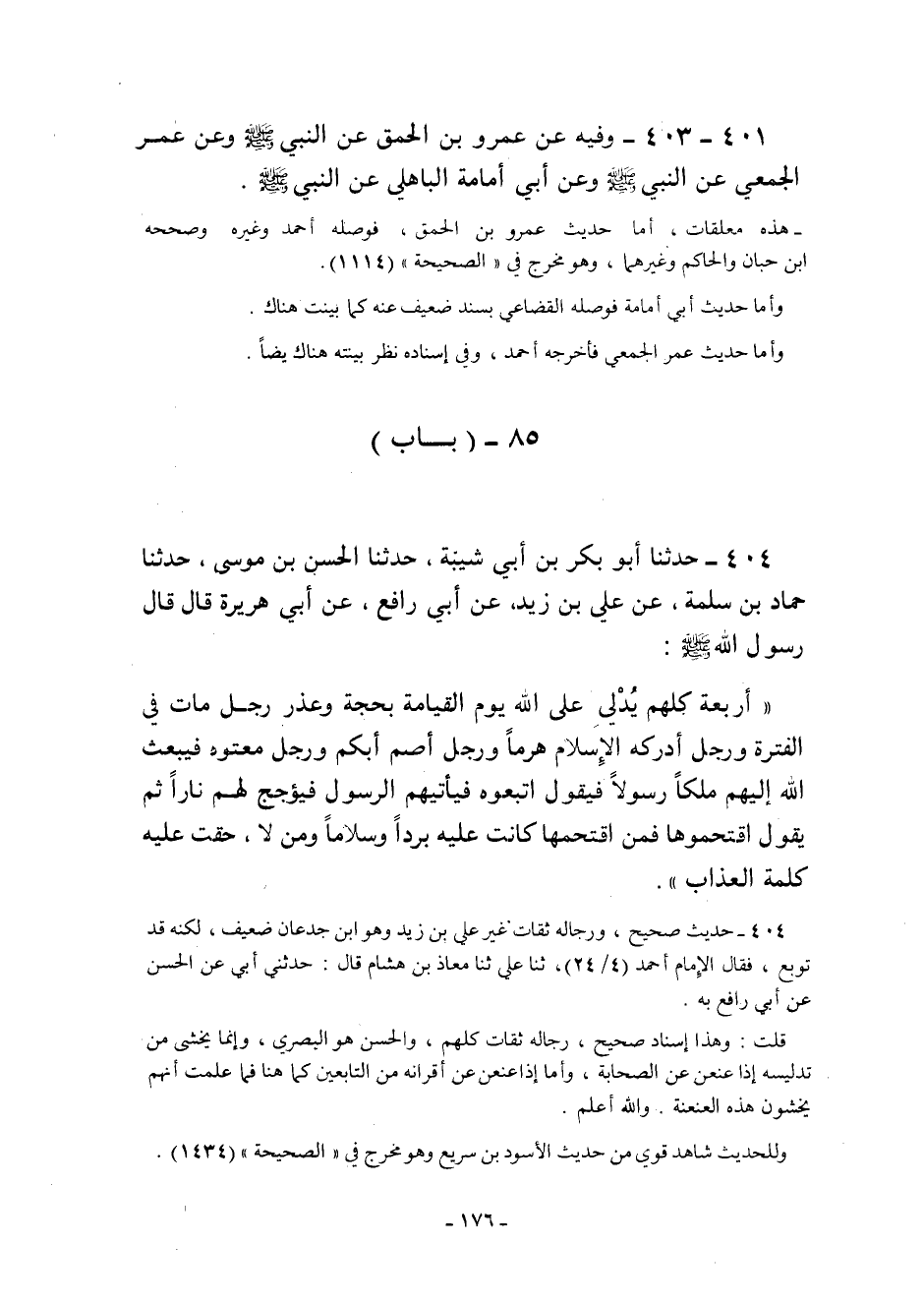 "باب" حديث: "أَرْبَعَةٌ كُلُّهُمْ يُدْلِي عَلَى اللَّهِ الْقِيَامَةِ بِحُجَّةٍ وَعُذْرٍ رَجُلٌ مَاتَ في الفترة...."